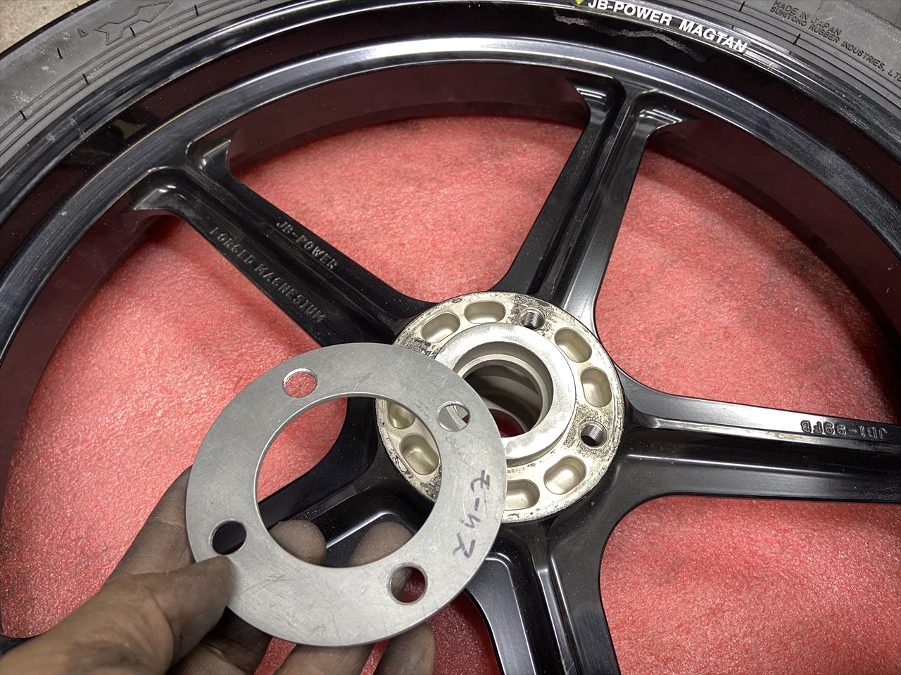右側はハブの出っ張りが干渉するので削ります。