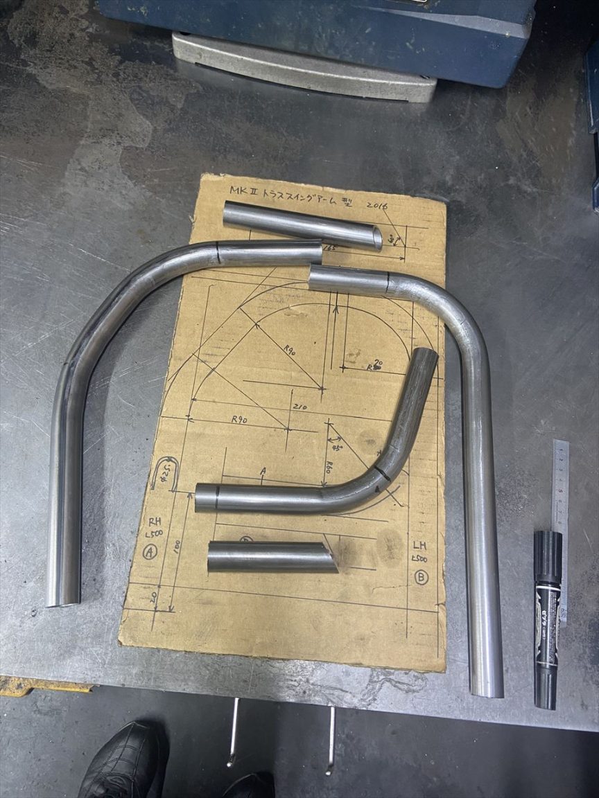 ワークススイングアーム製作の続きです。トラス補強パイプの材料を切り出します。