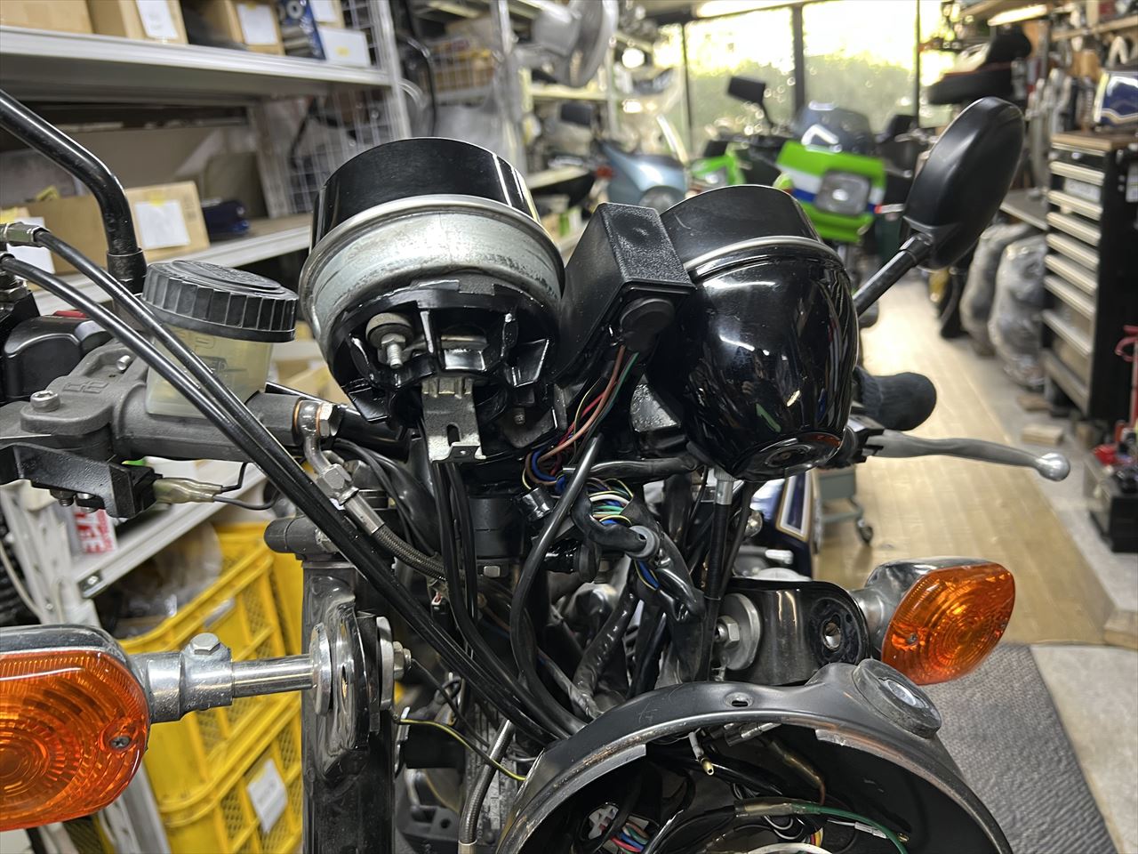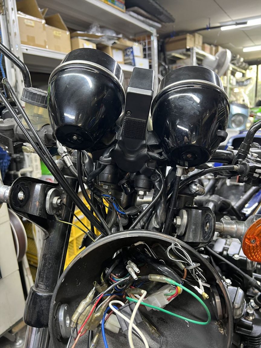 タコメーターからの配線は、ウオタニSP2のユニットから回転信号を拾い、電源などはヘッドライトケース内で接続します。