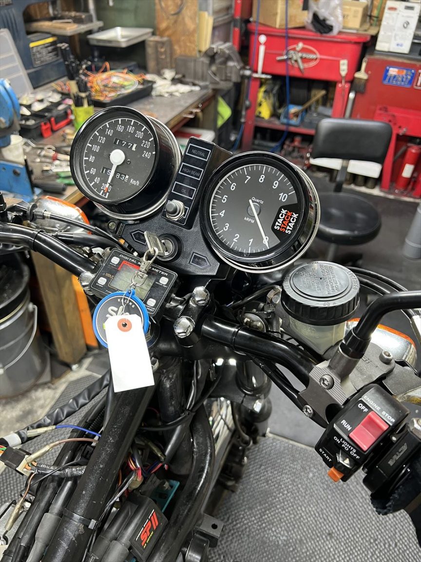 スタック製のタコメーターを取り付けます。モデルはST200、スケールは0~10000rpmの物で、純正メーターの中にビルドイン加工したものです。