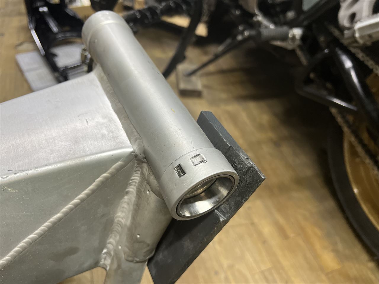 スイングアームはS1仕様でワンオフ製作されたものとのこと。使用歴があり、左のピボット部にはスプロケの歯が食い込んだ跡があります。