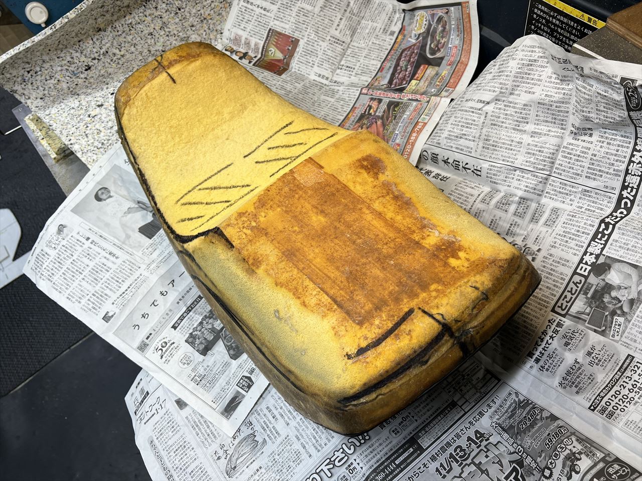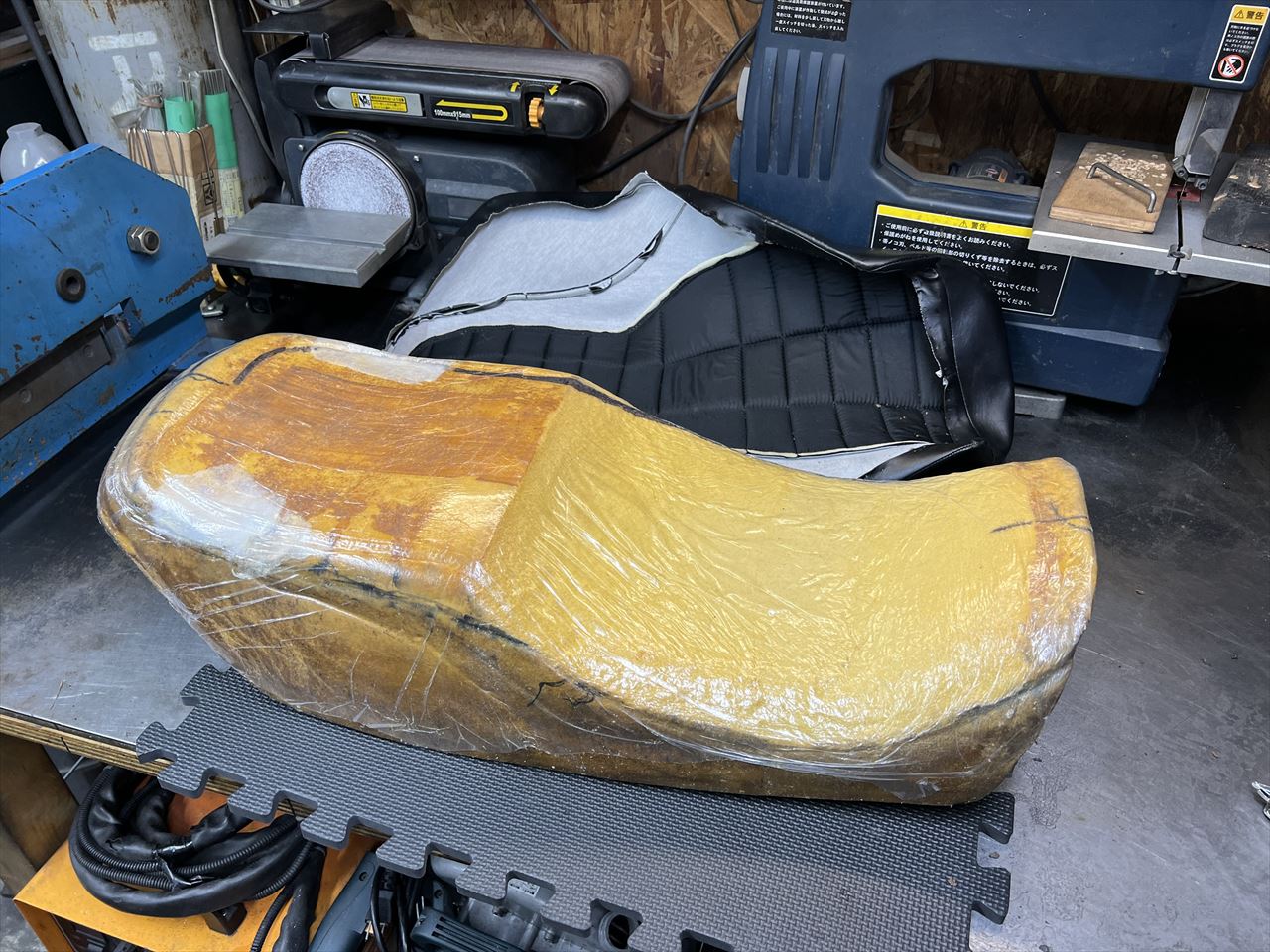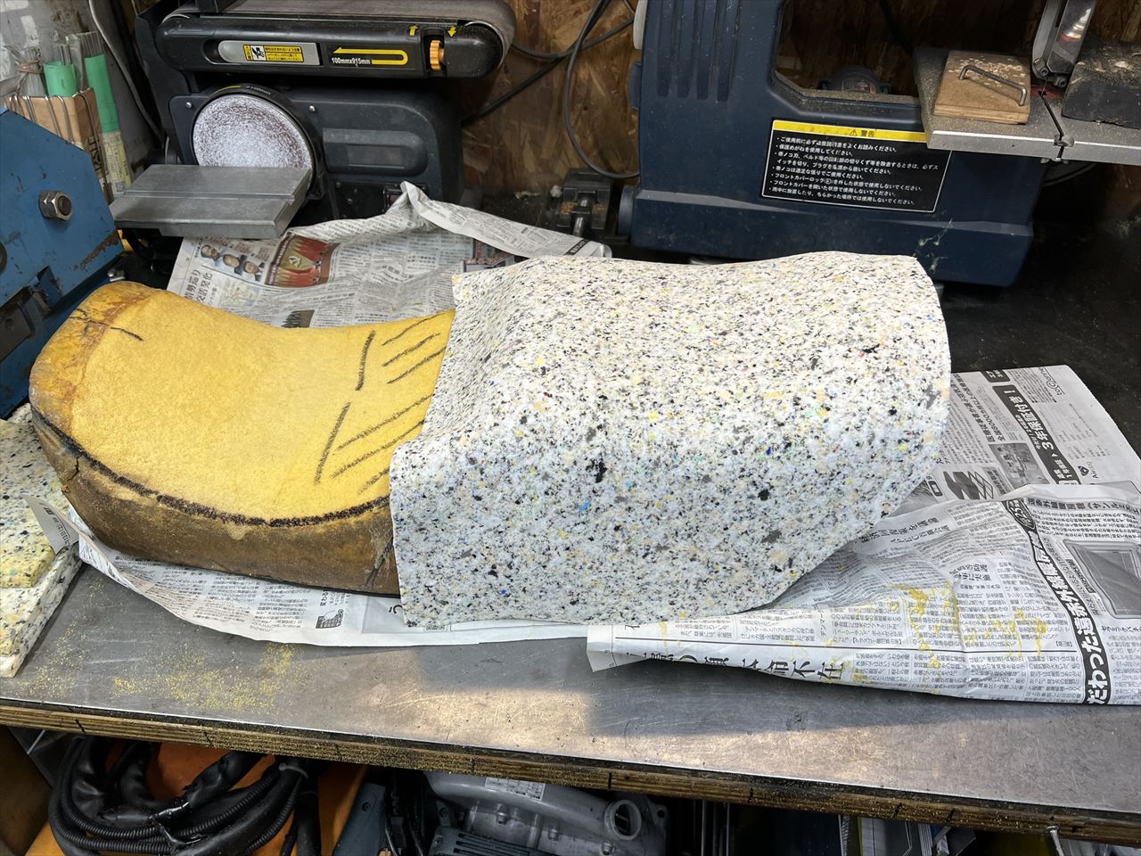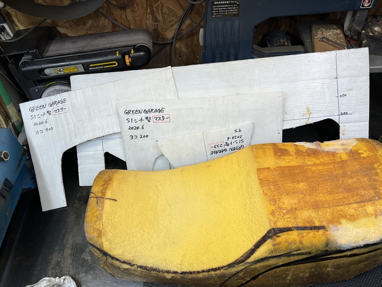 フレームのワークスS1加工に合わせてシートもワークスS1仕様に変更します。既にS1風に加工済みのシートですが、微妙に形状が異なるので作り直します。
