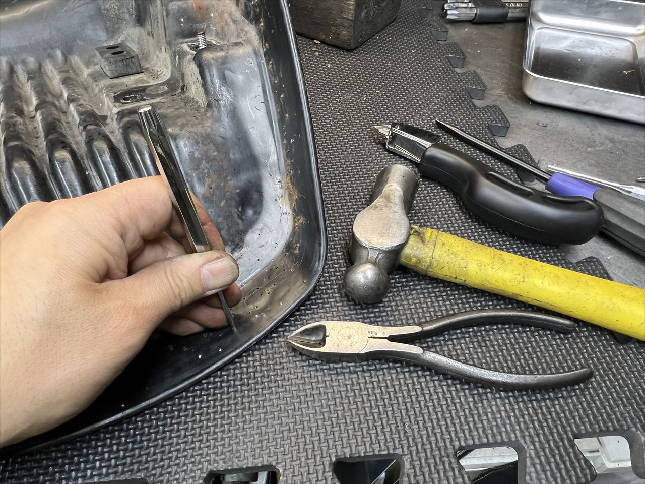 前回の加工は、古いタッカーの針をほとんど取らずに残してあります。錆が酷いので抜くのを省略したようです。