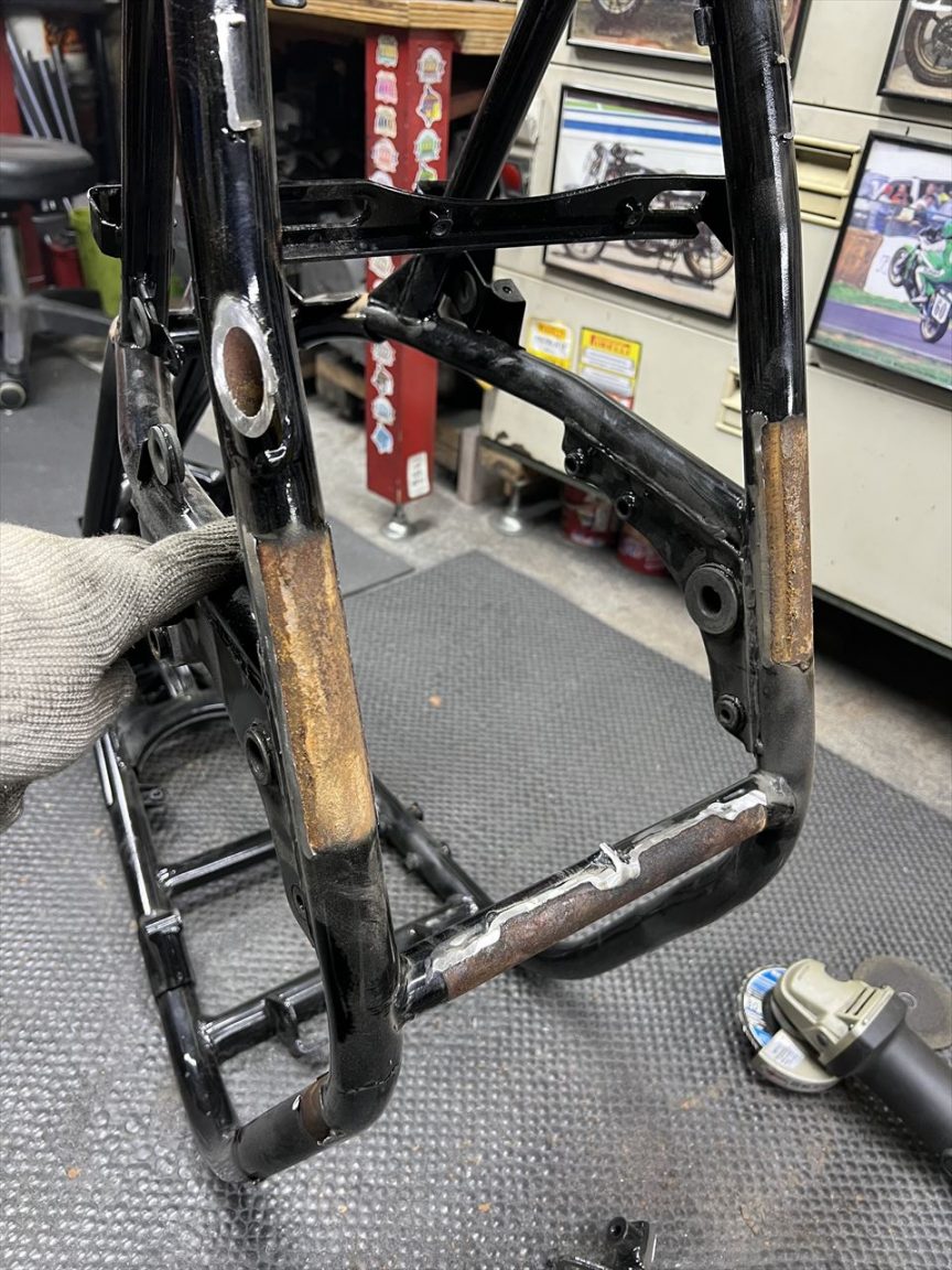 研磨するとさらにはっきりとわかります。こちらのフレームも脱着式サイドスタンドを付けるので、その際に開ける穴からフレーム内部の状態を確認しましょう。錆でパイプの肉がやせていたりしなければ、クラックの上からパッチを当てての修理でいけるかも。錆が酷ければこの部分のパイプを切断して新しいパイプに交換することも想定します。