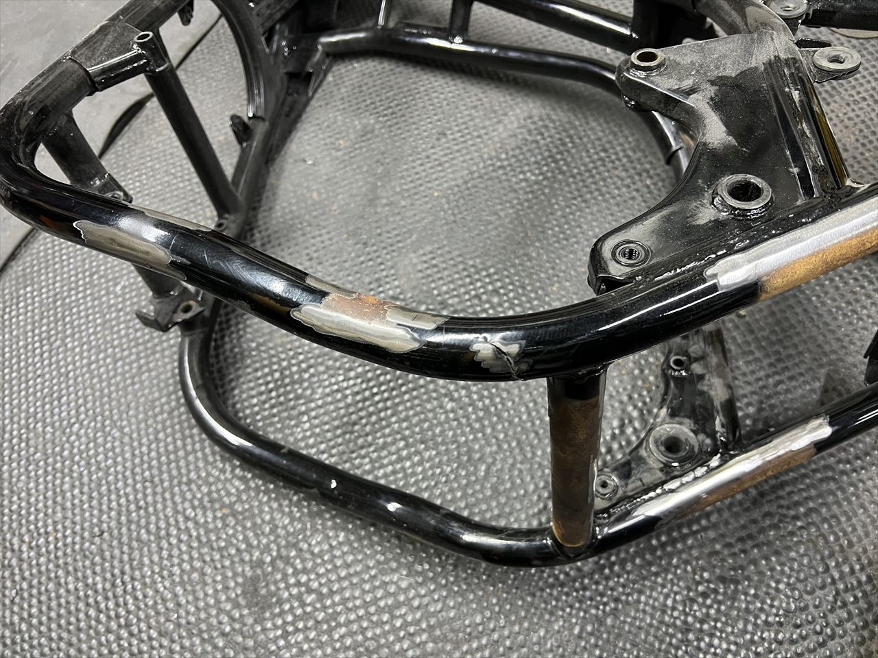 その最中に問題を発見。サイドスタンドブラケットのすぐ後ろに妙なキズがあります。