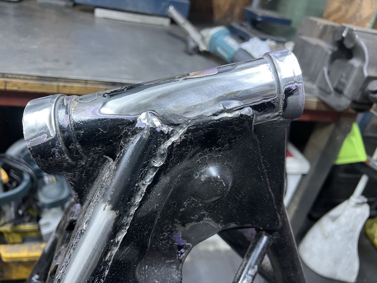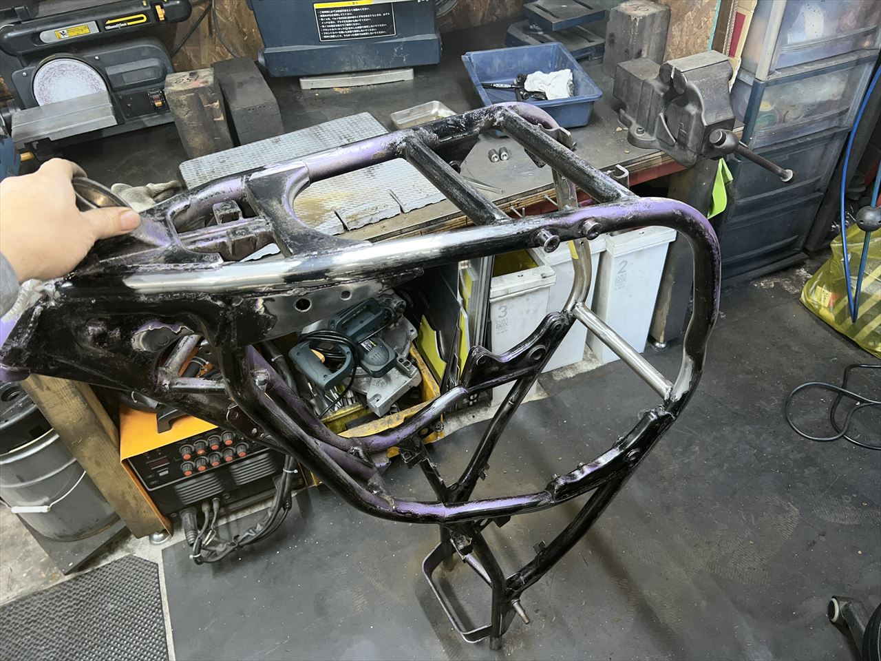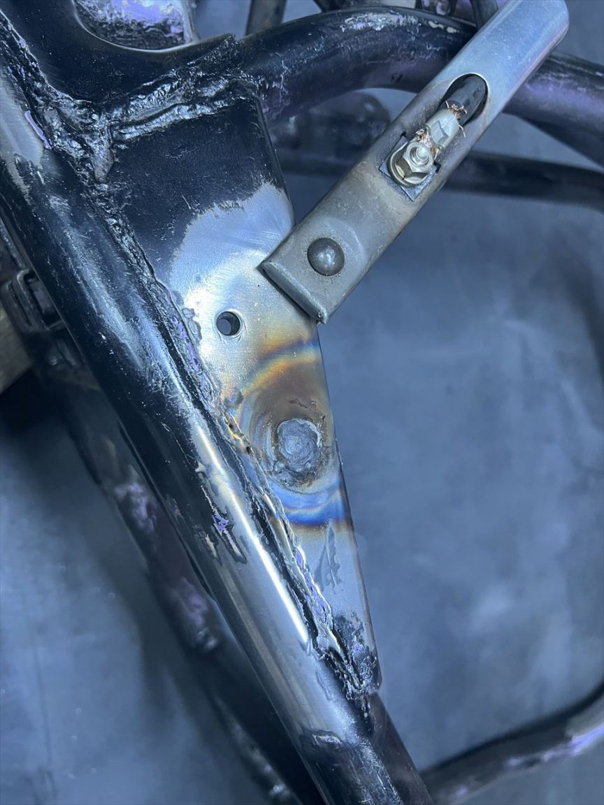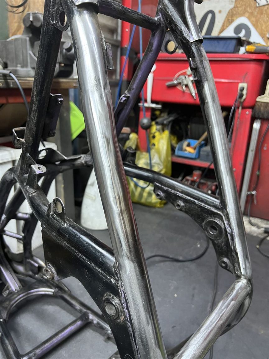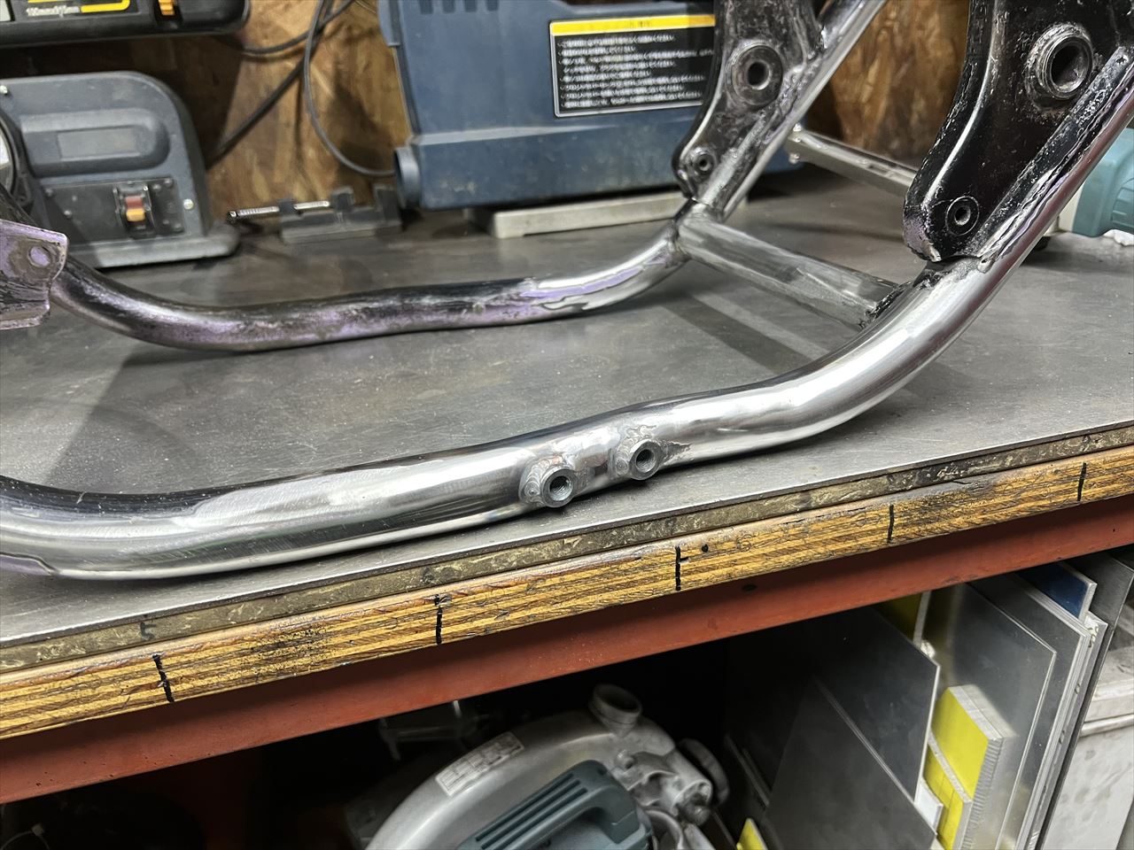 不要なステー類を削除した状態のフレームです。次に脱着式サイドスタンド用ボスの取り付けと、その周辺のクラックや傷などの修復です。