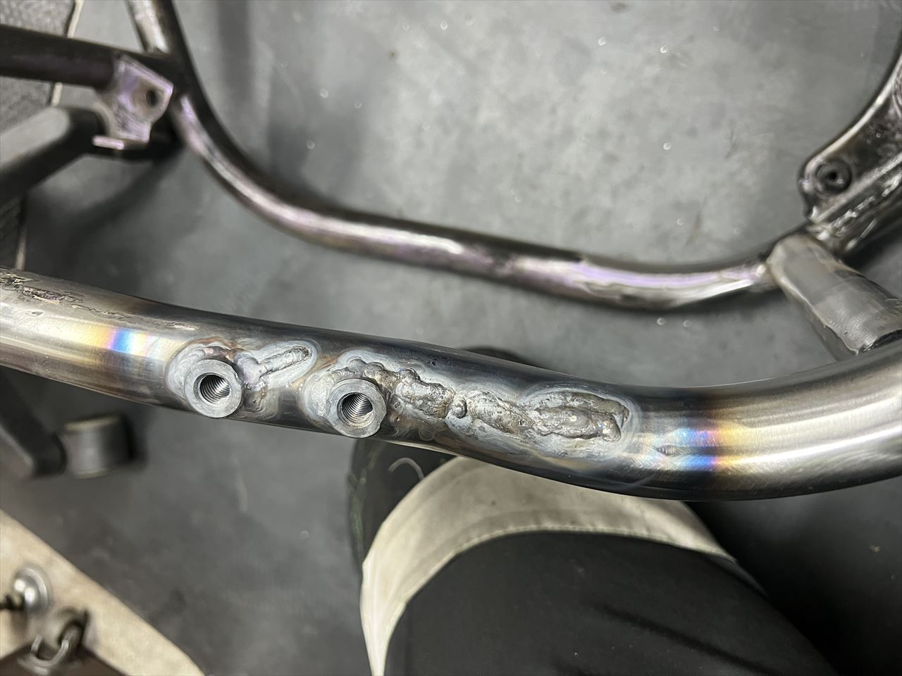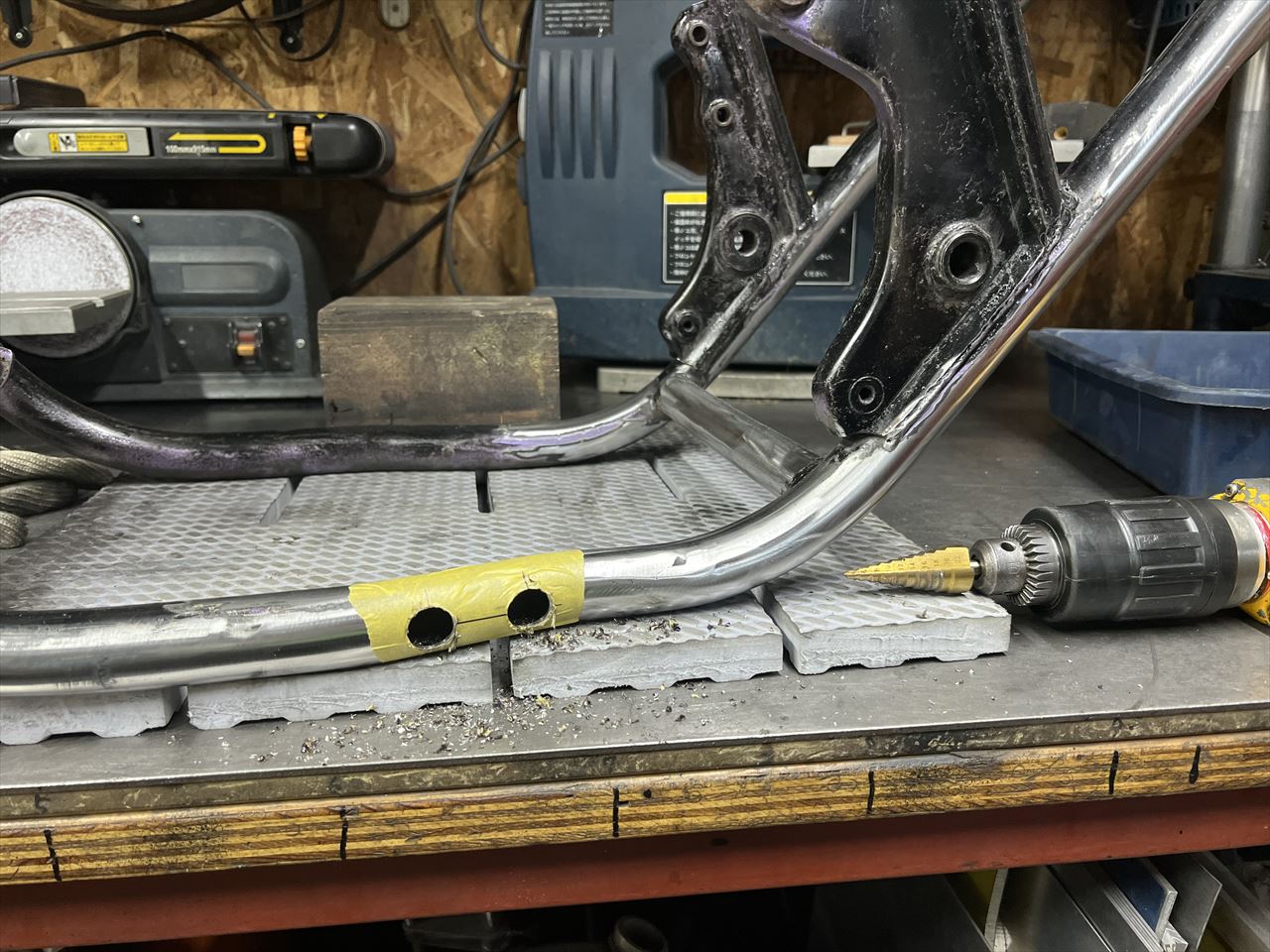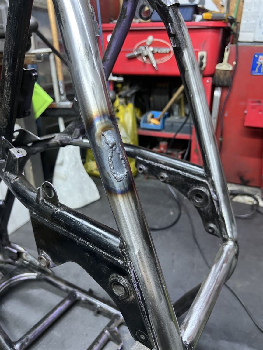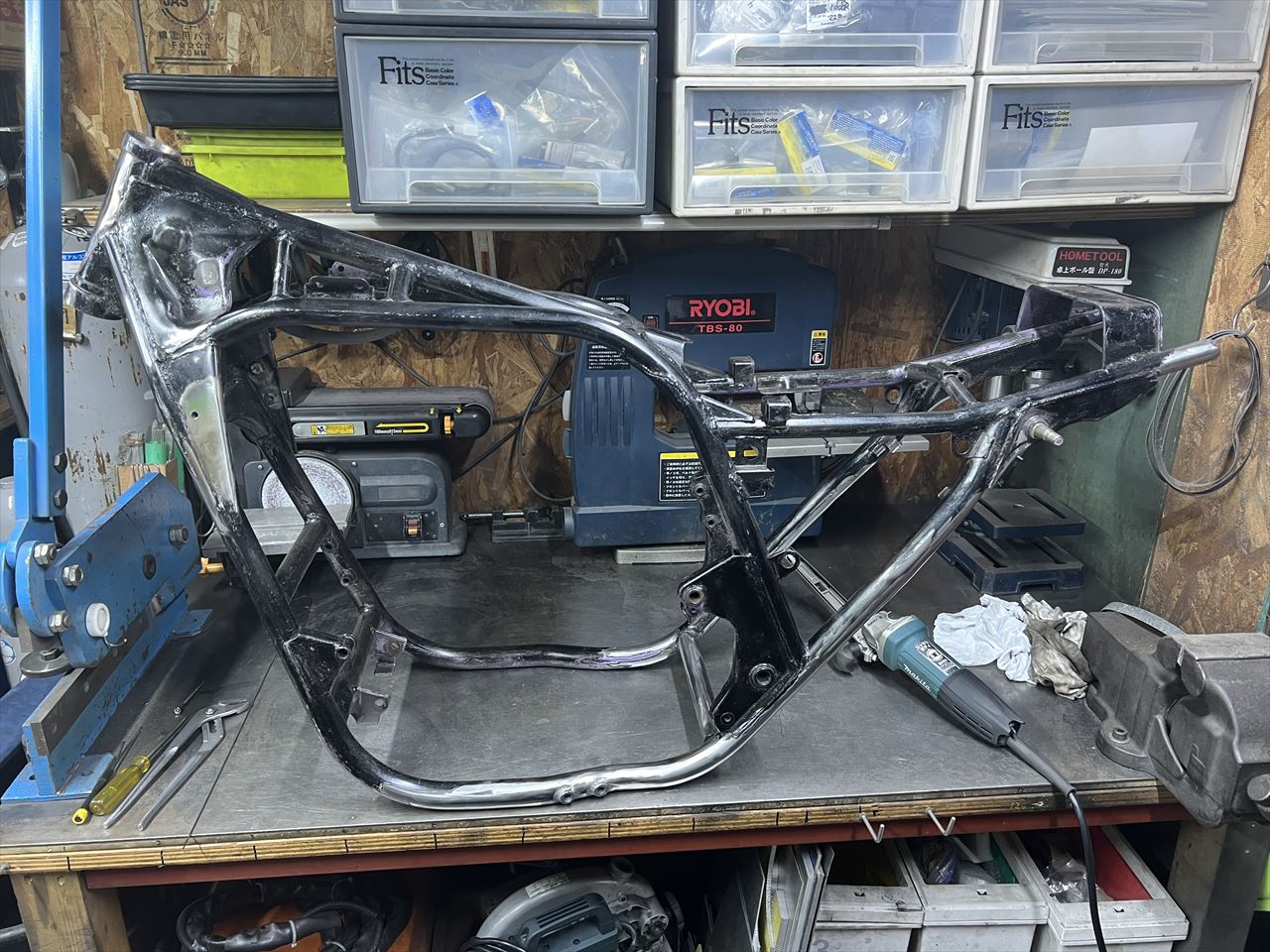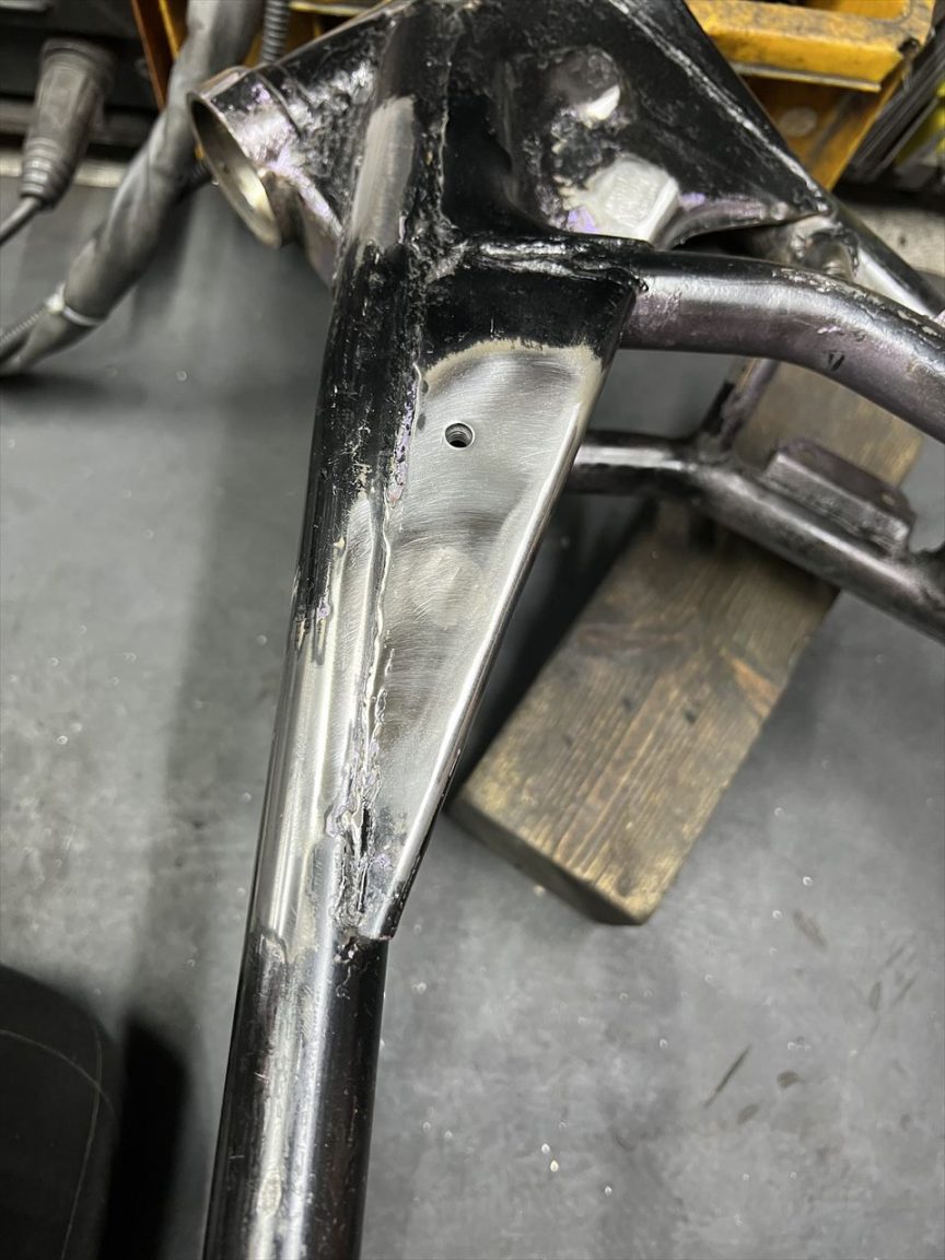 不要なステー類を削除した状態のフレームです。次に脱着式サイドスタンド用ボスの取り付けと、その周辺のクラックや傷などの修復です。
