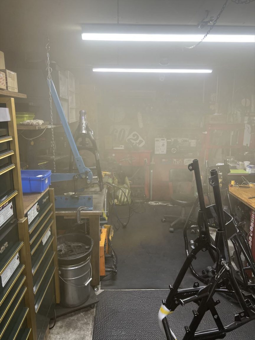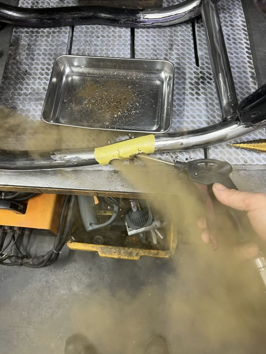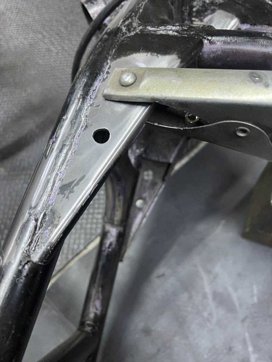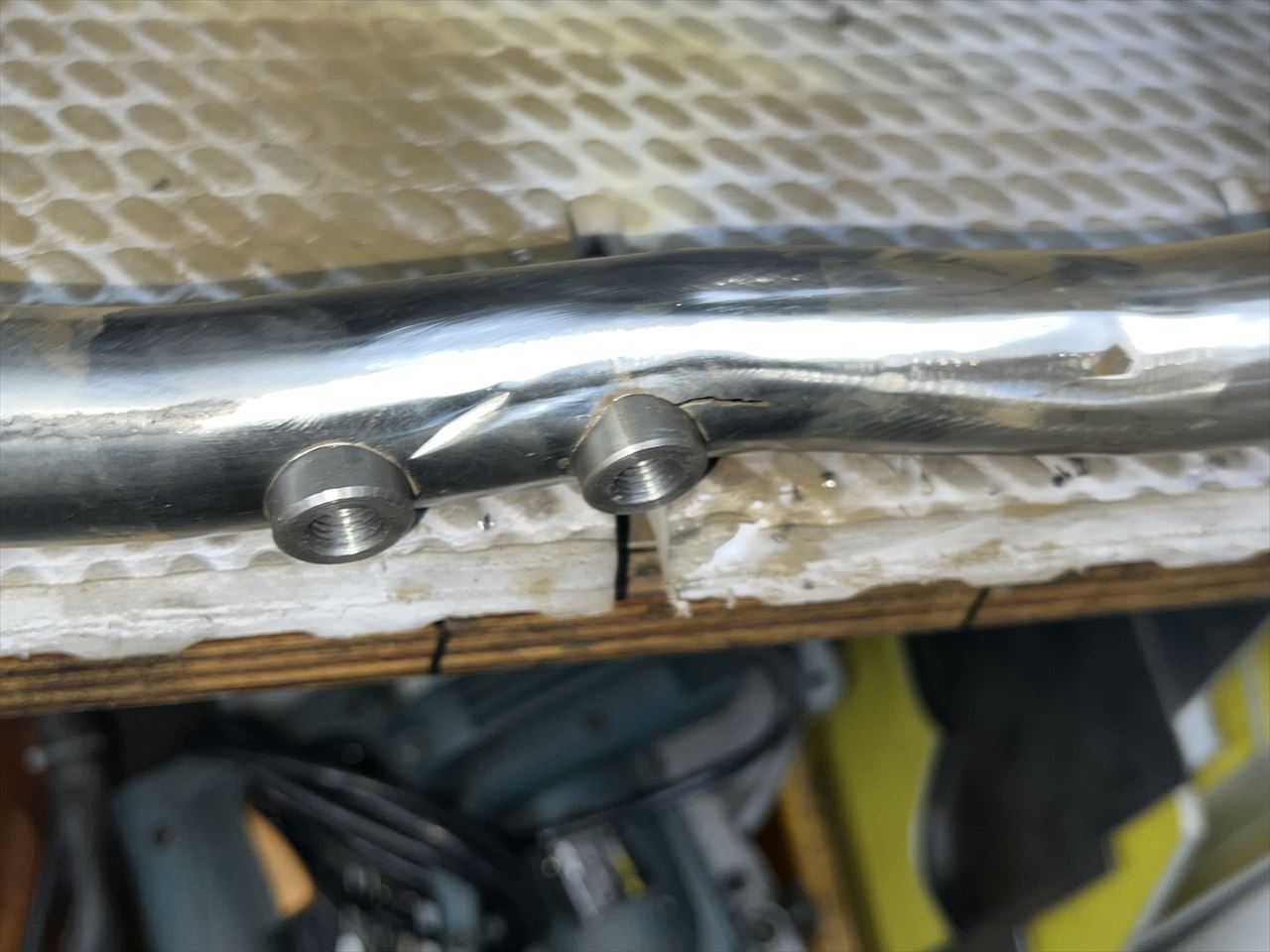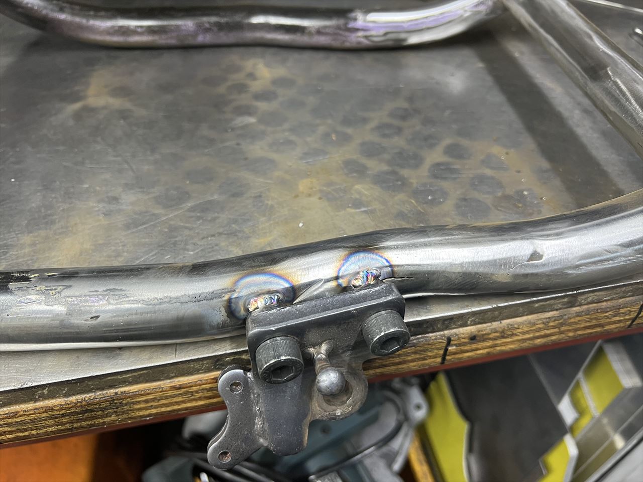 不要なステー類を削除した状態のフレームです。次に脱着式サイドスタンド用ボスの取り付けと、その周辺のクラックや傷などの修復です。