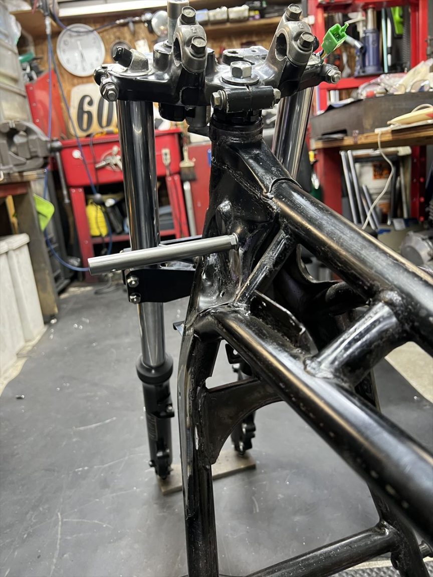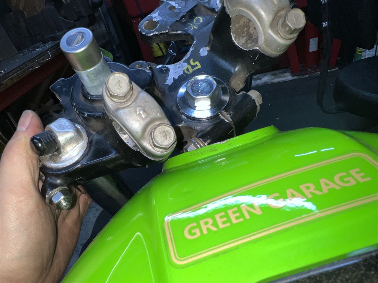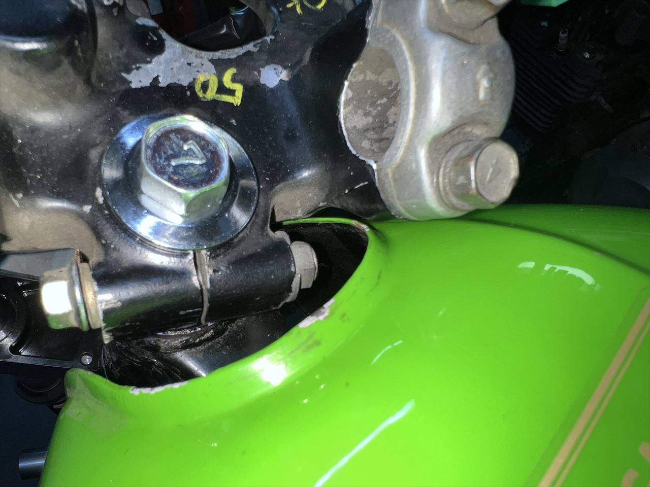 少なくなったハンドル切れ角ではありますが、タンクとのクリアランスは2ミリほどとごくわずか。