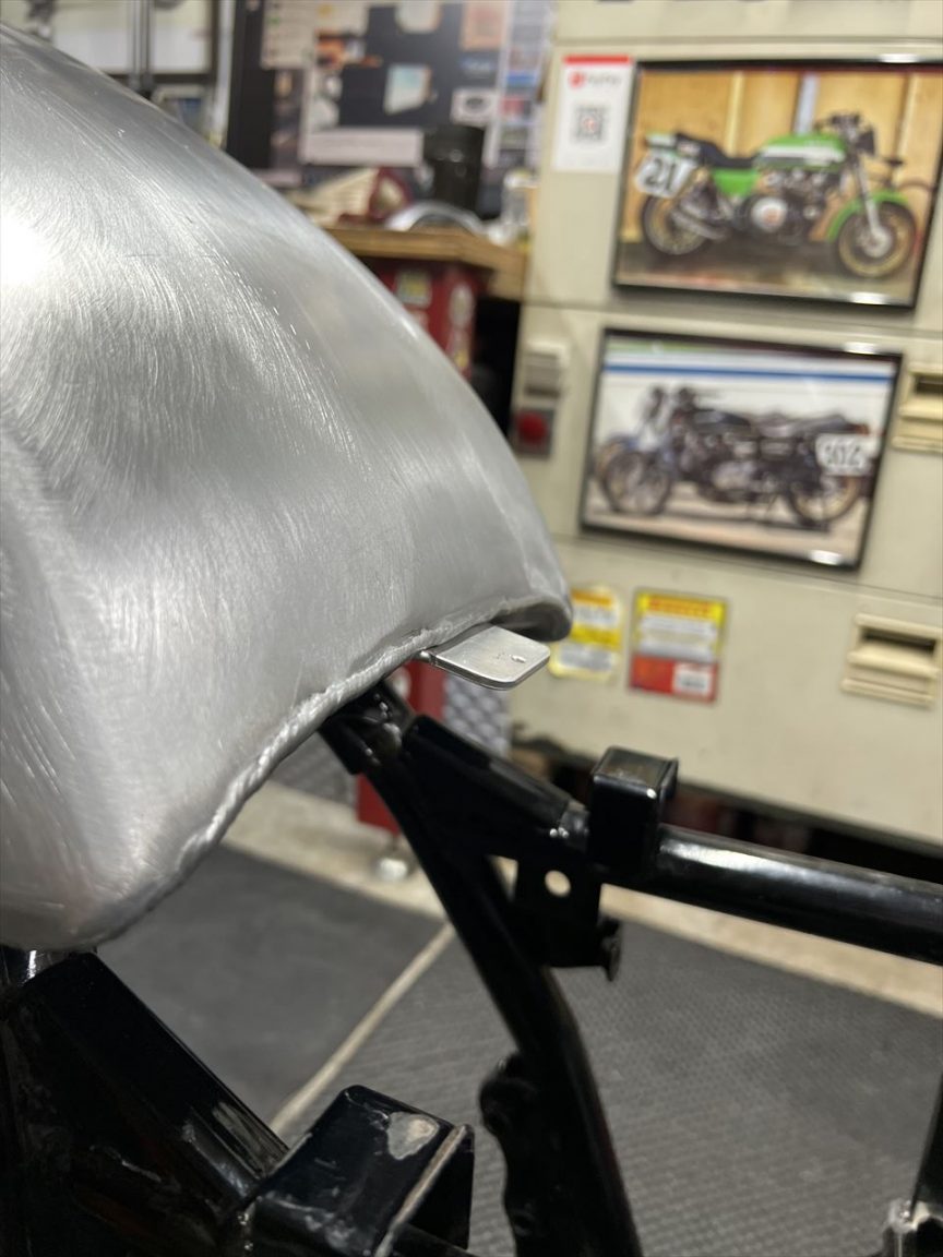 お持ち込みのアルミタンクを載せます。こちらはTOP ENDさんプロデュースのビーター製とのこと、角タンクフレーム用に作られた丸タンクです。前側マウントの内幅が角タンクフレーム用に狭くできています。