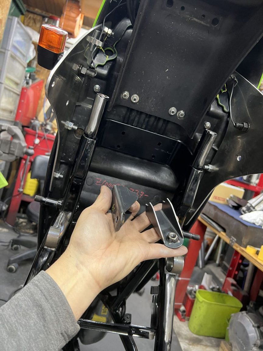 仮付けしたZRX400改のスイングアームと、お持ち込みの取り付け予定のS1スイングアームを比較します。S1スイングアームの方が少し狭いので、この状態で合わせておけば大丈夫でしょう。ちなみにこちらのS1スイングアームは、ピボットのテーパーローラーベアリング部分が広がってベアリングがガタガタなので、ピボットを切断してニードルローラーベアリングに変更する予定です。