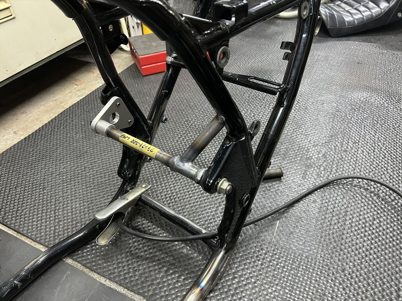 マフラーステーを現車合わせで溶接するので、ダミーのエンジンを搭載します。先ずは足回りを仮付けします。