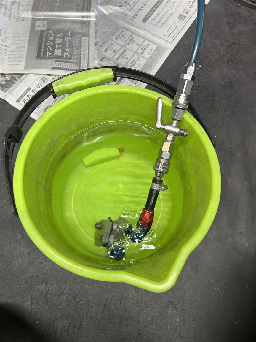 水中でエア圧をかけて漏れチェックします。