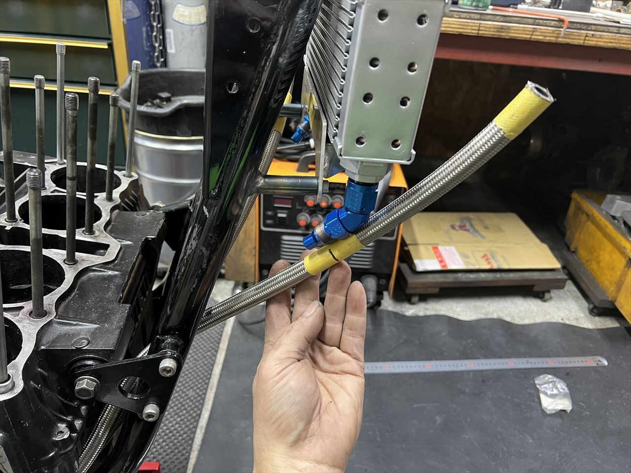 純正のオイルクーラー取出しを加工して使います。ダミーエンジンを治具代わりにして溶接で仮止めします。
