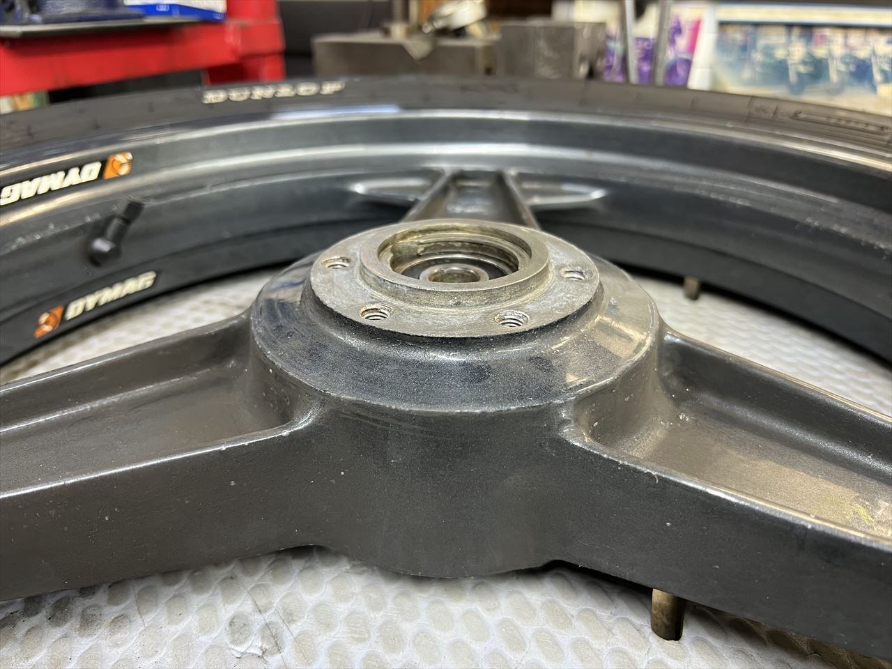 ダイマグはタイプが幾種類もあり、現物を計測して製作することになります。こちらはM8ボルトの6穴仕様なので、取り付けはこのネジ穴を使います。ベアリングはローター側に設置するので、ホイール側のベアリングは外すことになります。ひとまず計測が終わったのでホイールは直ぐに返送します。今後、ローターの設計・製作を進め、数か月後に完成してから車両を入庫していただきます。