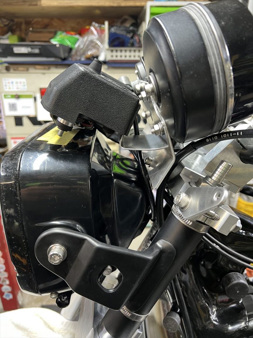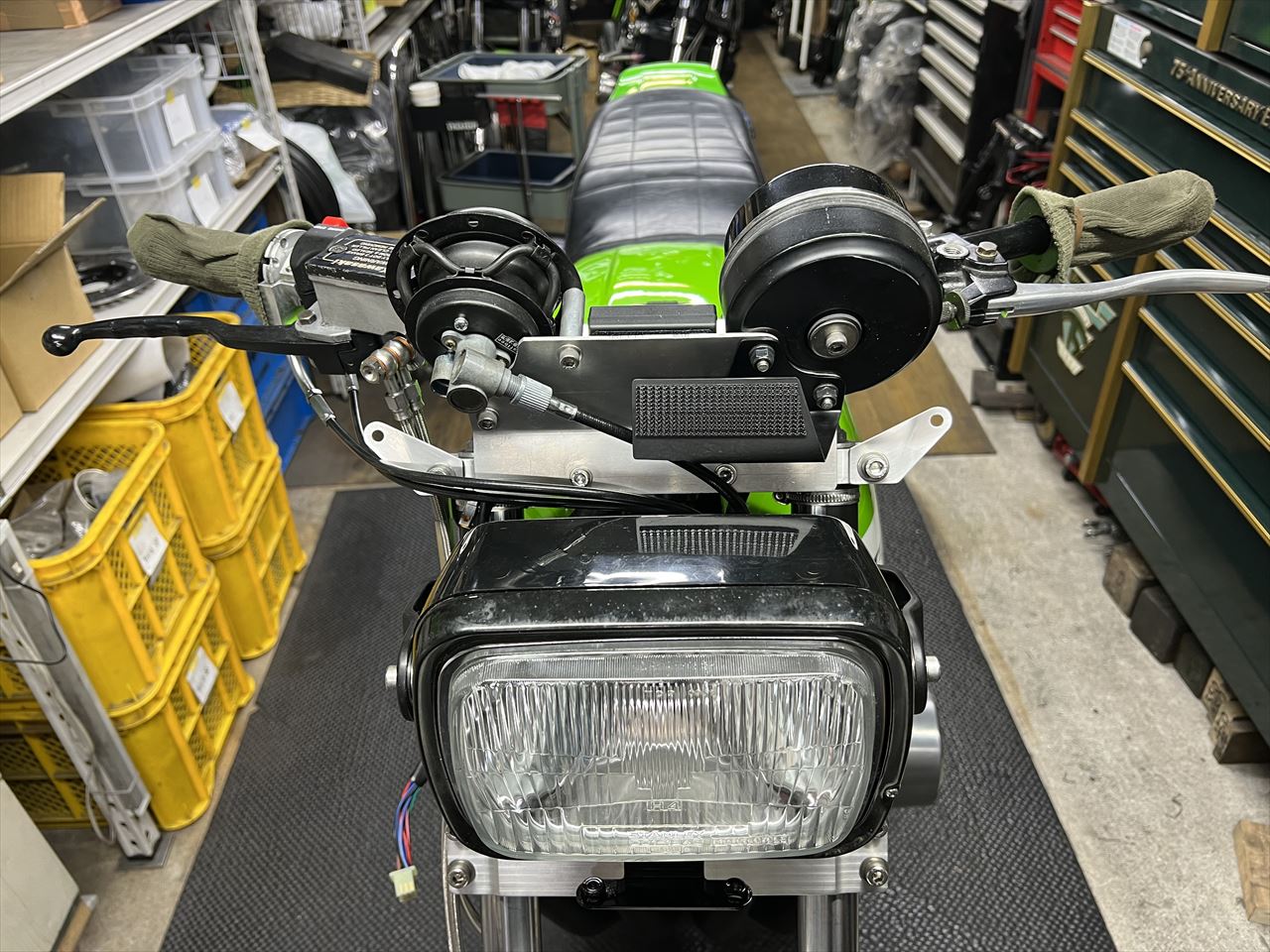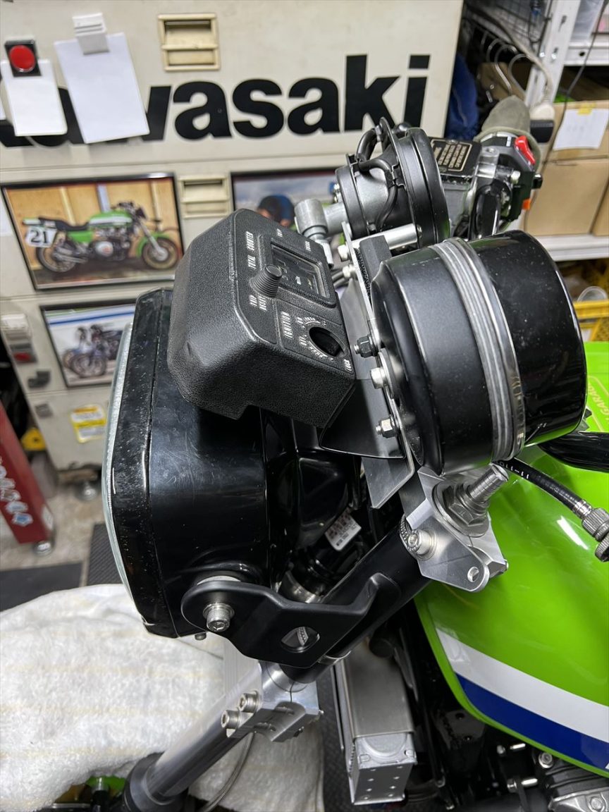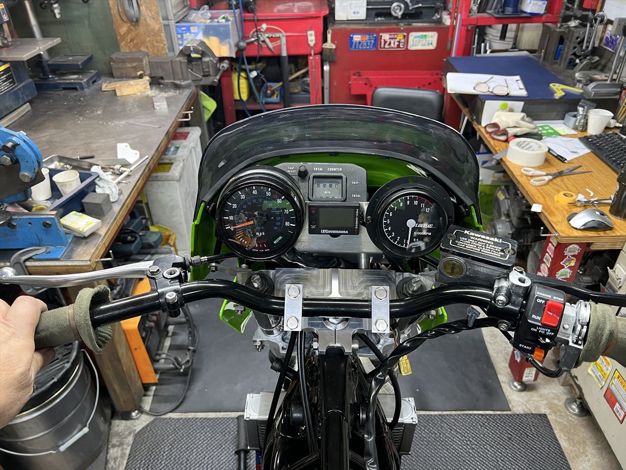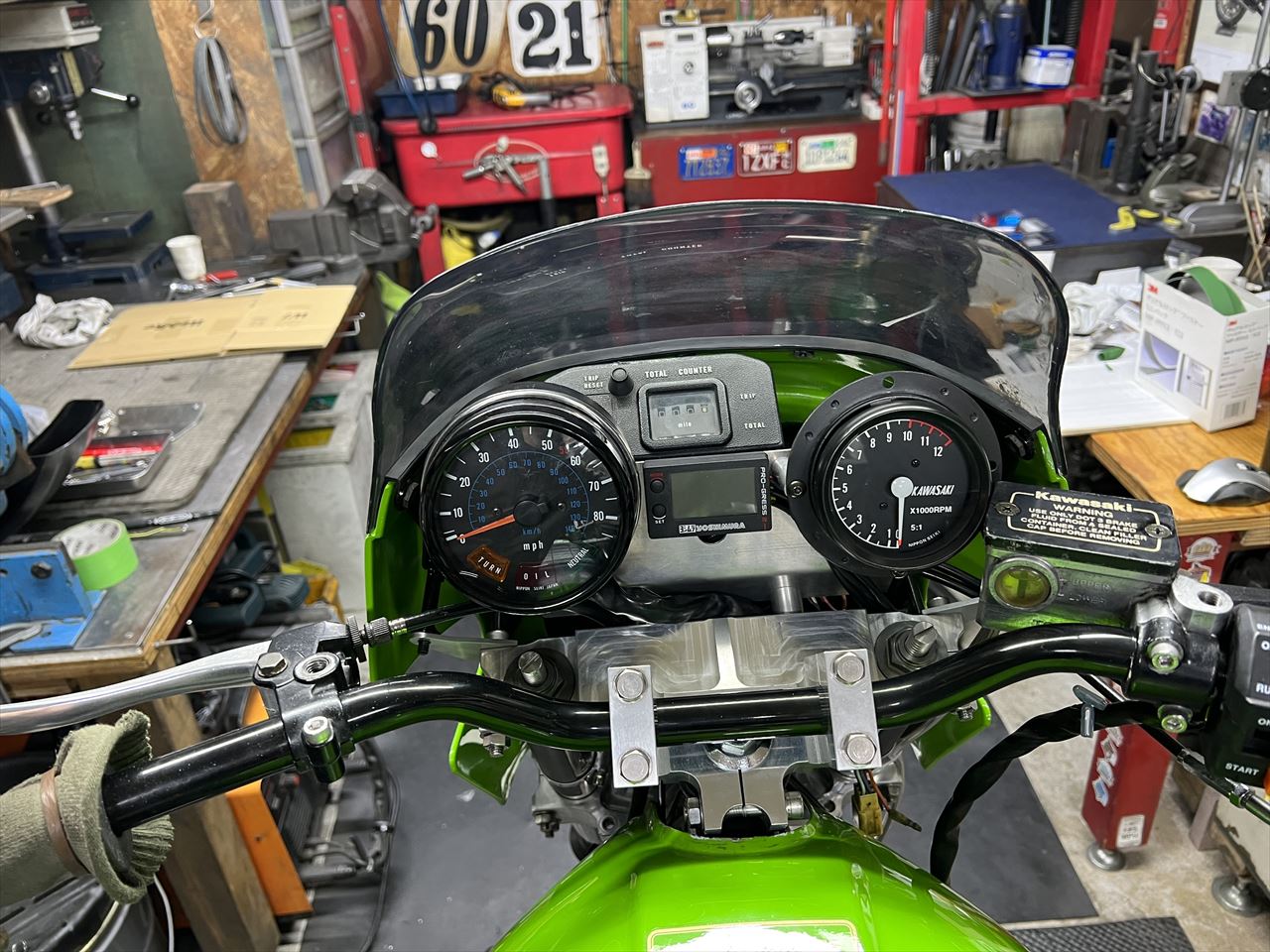 トリップメーターはヘッドライト上のスペースに収めることにしました。ディスプレイ時やサーキット走行では外し、レーサーライクなコックピット周りに仕立てるためです。