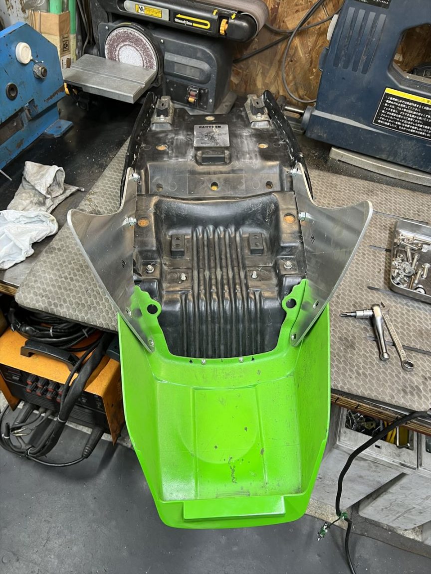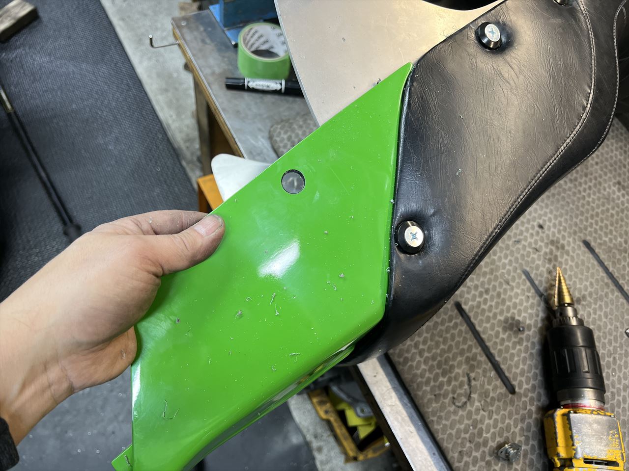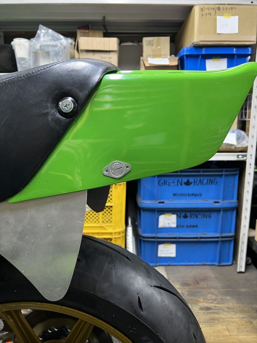 リベット止めし、テールカウルの交換ができました。このテールカウルもあくまで暫定です。本命の外装一式は現在塗装中なので、塗装が完成したら再度交換する予定です。