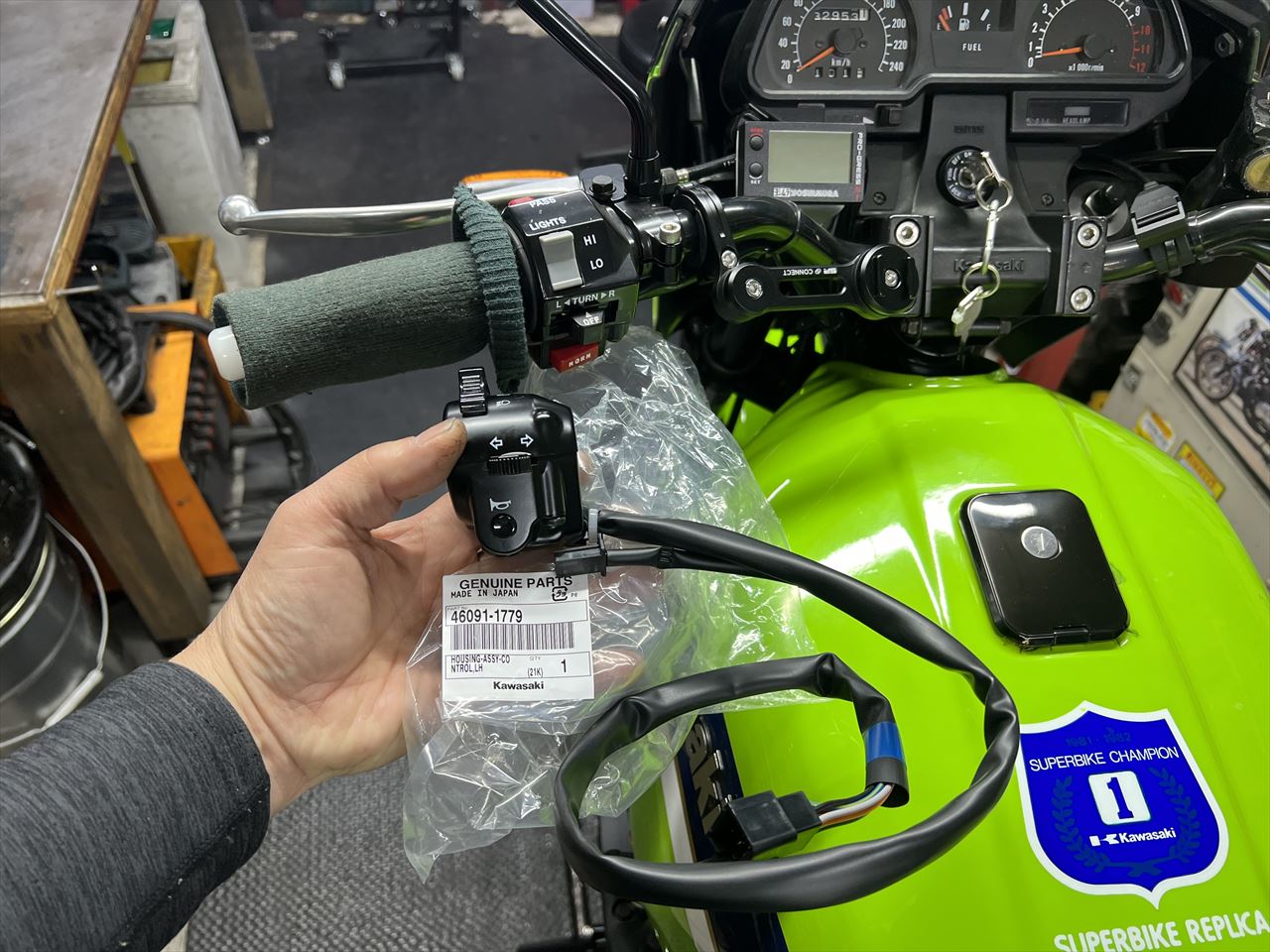 ハンドルスイッチは社外品のOWタイプにしていましたが、ウインカースイッチのタッチが悪いとのことで、よく使うW650の純正品に変更します。このあたり、スイッチ関係の品質は、やはり純正品に分がありますね。