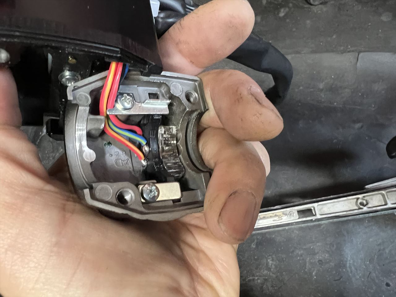 ハンドルスイッチを取り付けます。ハンドルをいっぱいに切ってもハーネスに余裕があるように固縛します。