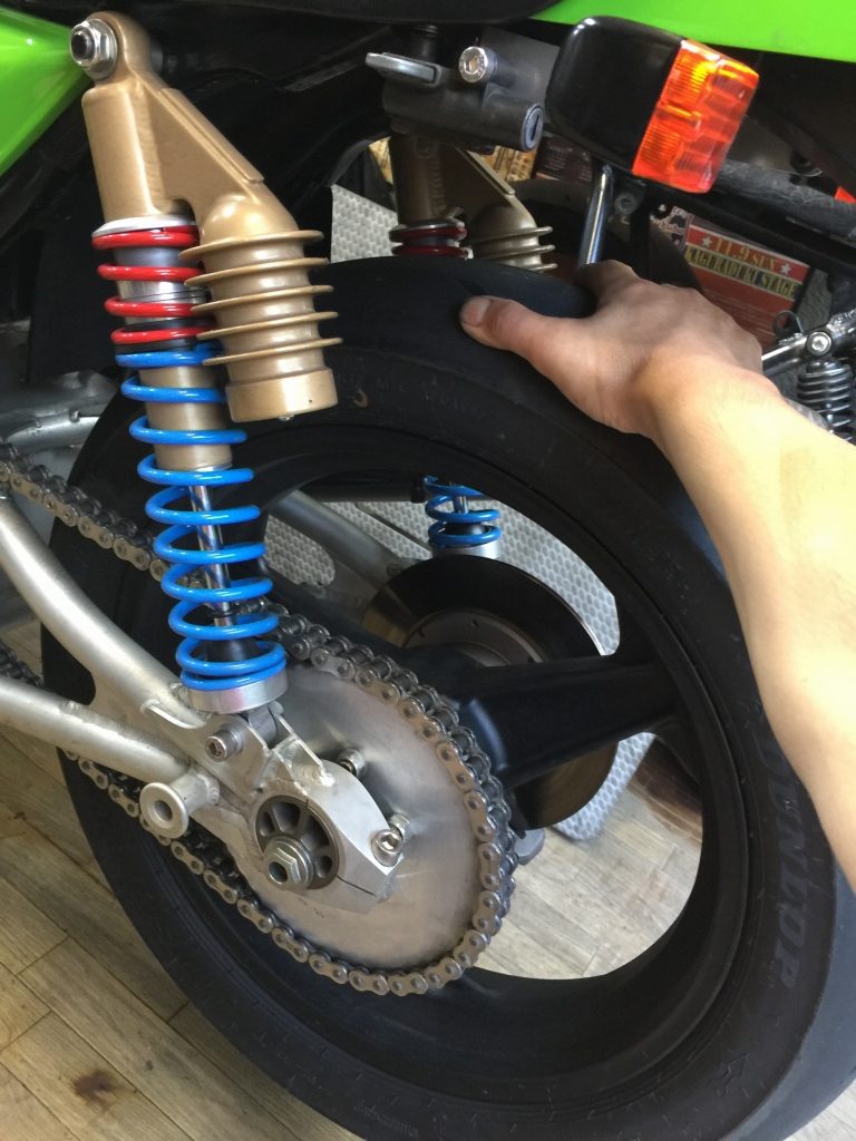 ジャッキアップして、スイングアームピボットのガタが無いか確認します。