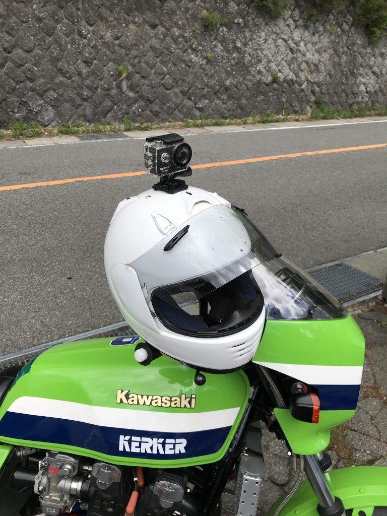 ビデオカメラをヘルメットに装着、防振対策したスピードメーターの針の振れなどを撮影。