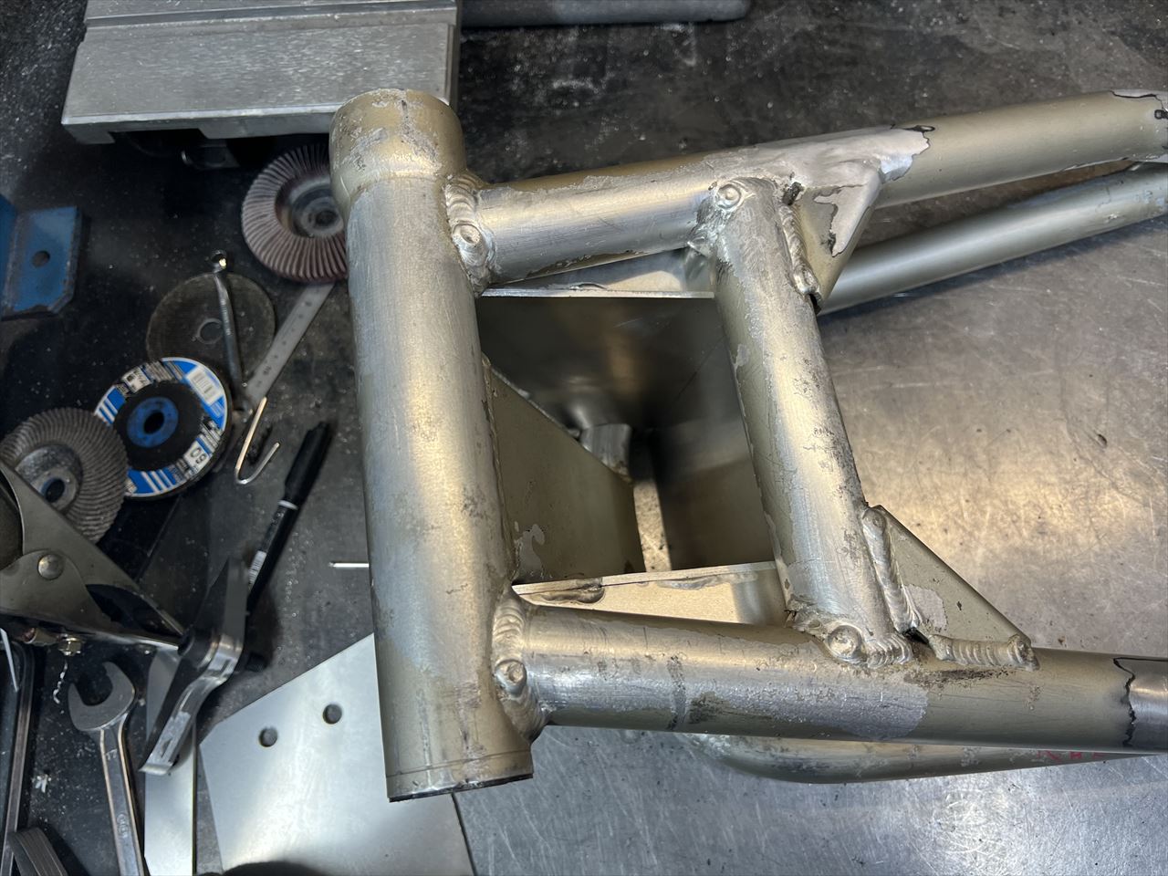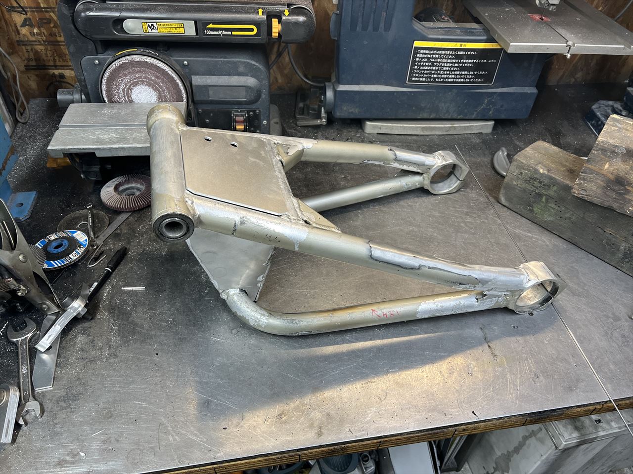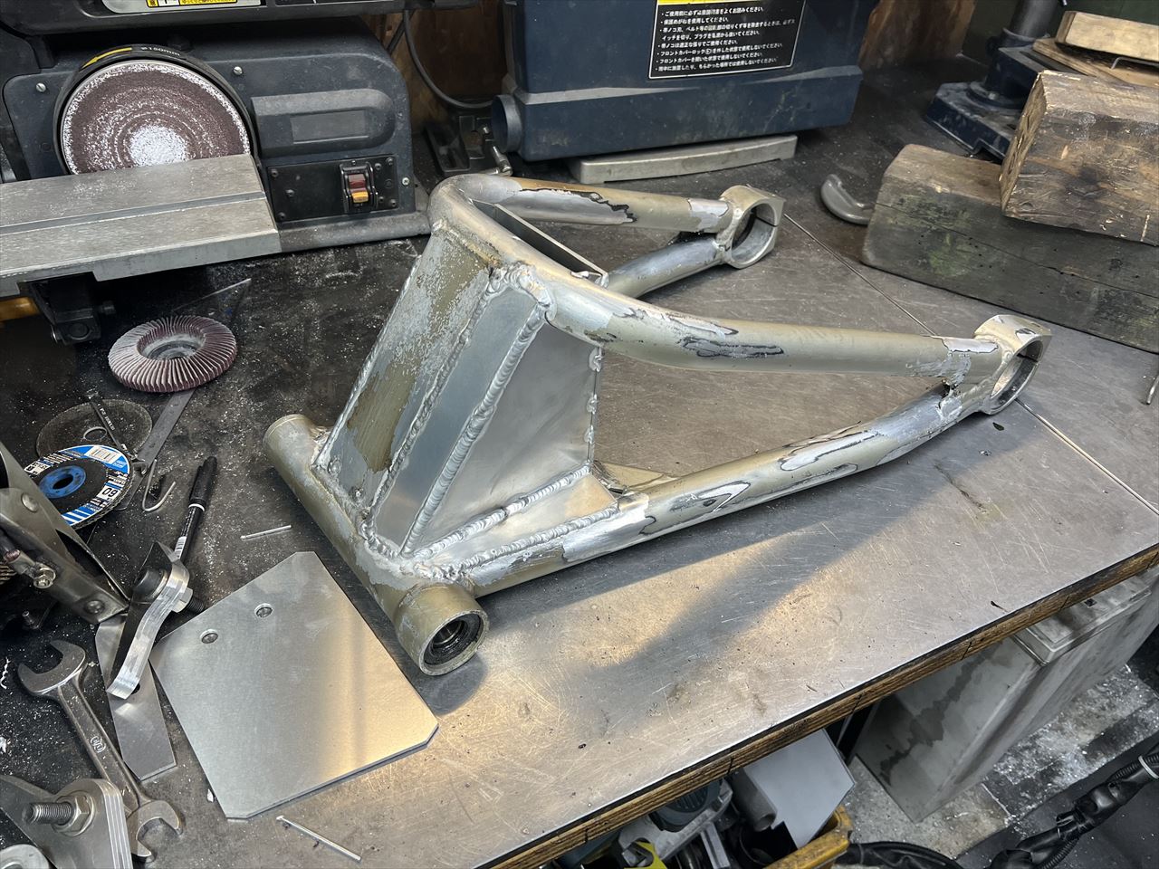厚紙で作った型をもとにアルミ板を切り出し、スイングアームに合わせて微調整しながら、先ずは基準となる1枚を溶接します。