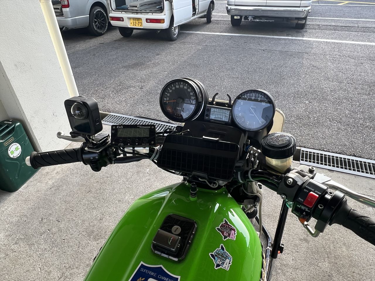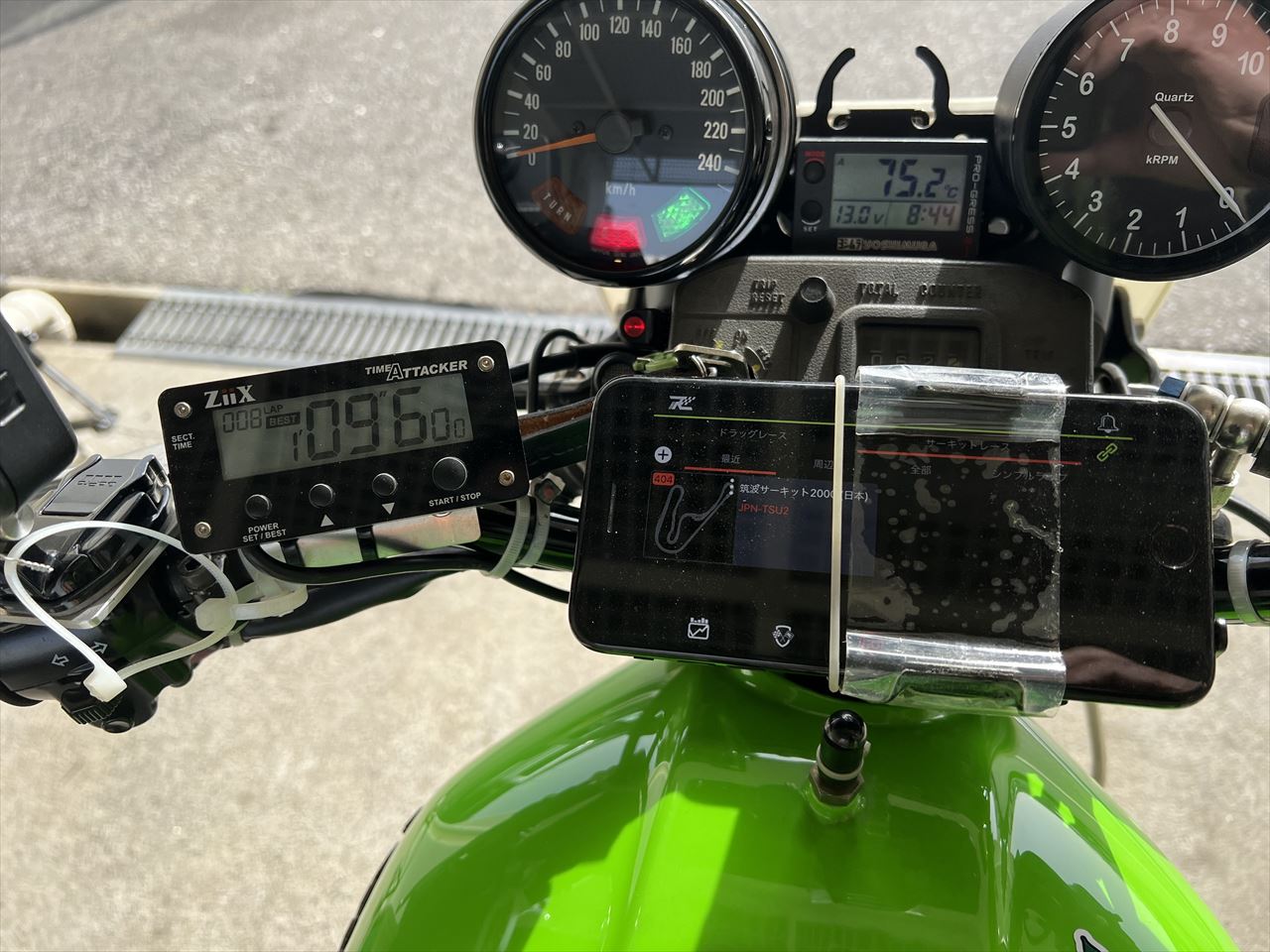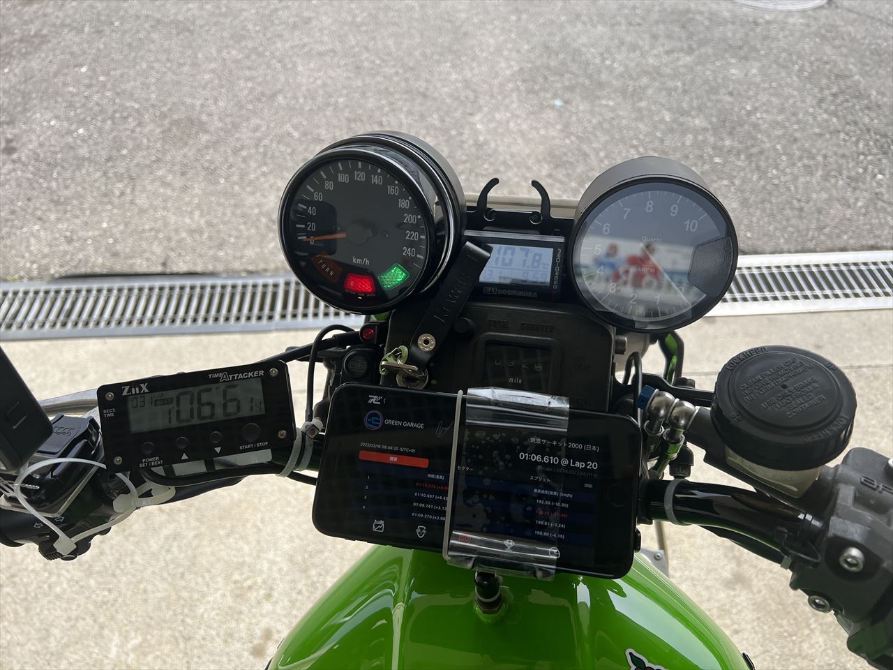 今回、他にも新しいデバイスをテストします。GPSラップタイマーのQSTARZ(キュースターズ)BL-1000GTです。モニターとしてスマホを使用するのでハンドルの上に装着。今までのラップタイマーも併用し、違いもチェックします。