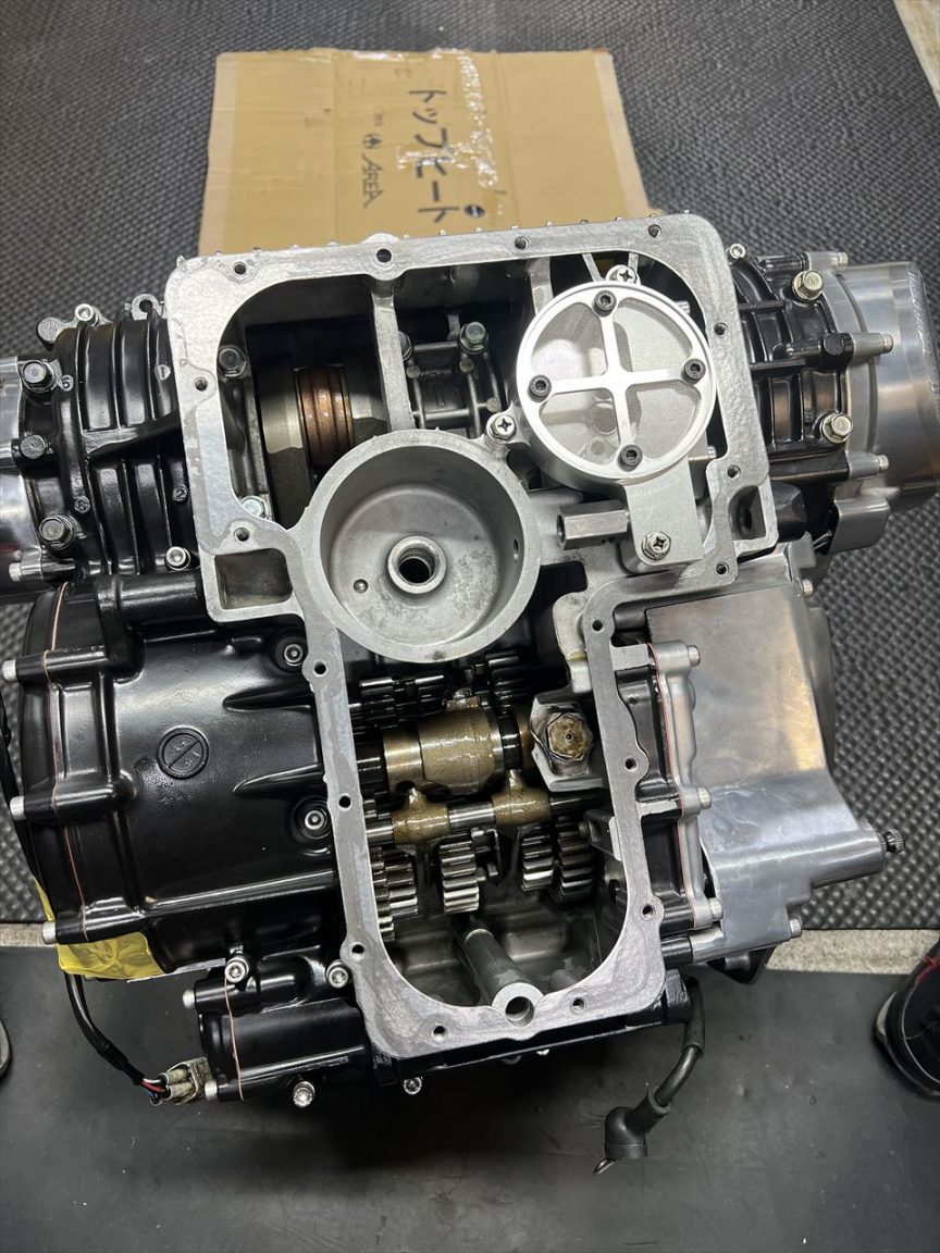 せっかく1200ccにするならと、ハイプレッシャーオイルポンプに変更することに。車載前のエンジンを裏返してオイルパンを外します。
