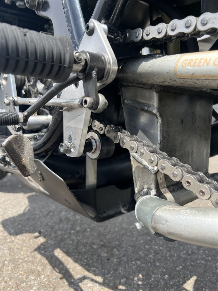 今回よりドライブチェーンガイドローラーを装着しました。1ヘアの立ち上がりやアジアコーナー後の3速シフトアップ直前など、2速での強力な全開加速体勢の際に、リヤスプロケットへチェーンが乗り上げるような衝撃がありました。リヤの車高が高いために、1Gでのチェーンの弛みはかなりあり、加速力が強いとスイングアームがアンチスクワットで下に押し下げられるので、更にチェーンが弛むことになります。その時チェーンが暴れて歯飛びしかけるのだと思います。その防止対策です。