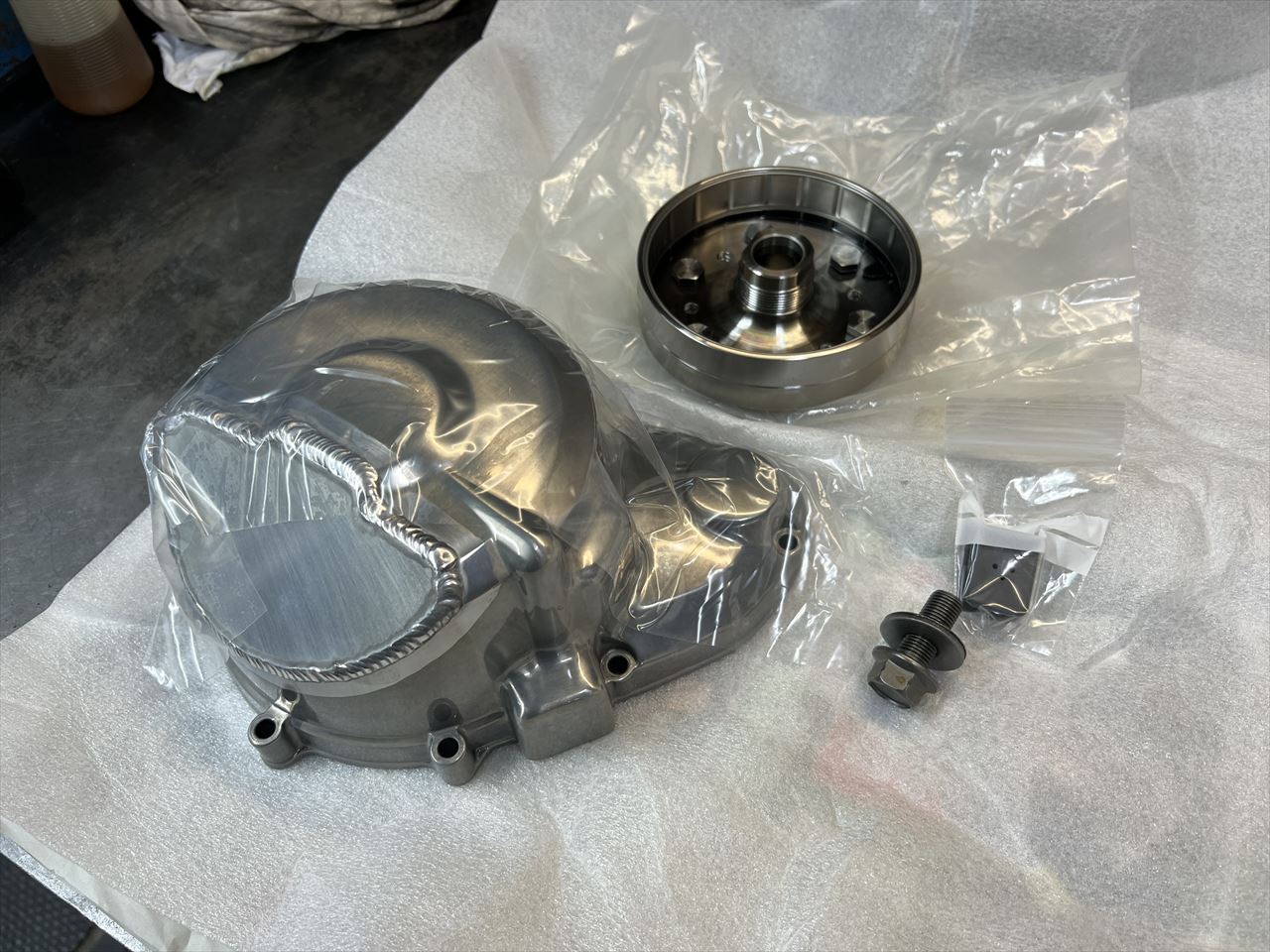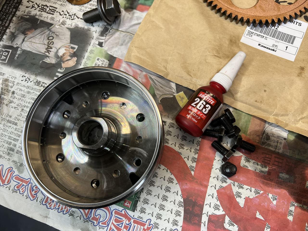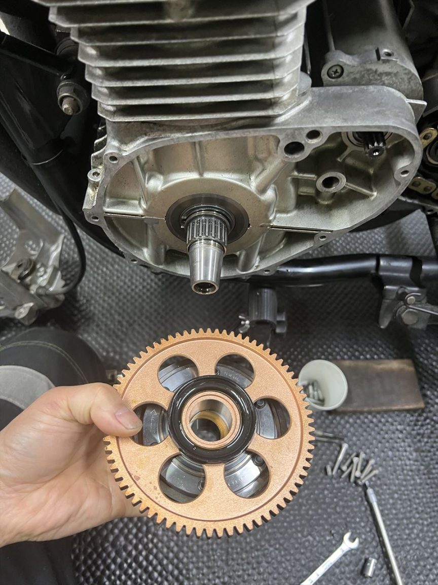 キットの内容はこちら。右のスターターギヤはノーマルが流用できますが、今回はこれも新品に交換します。