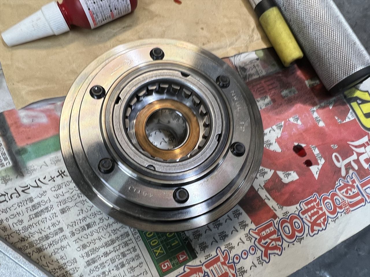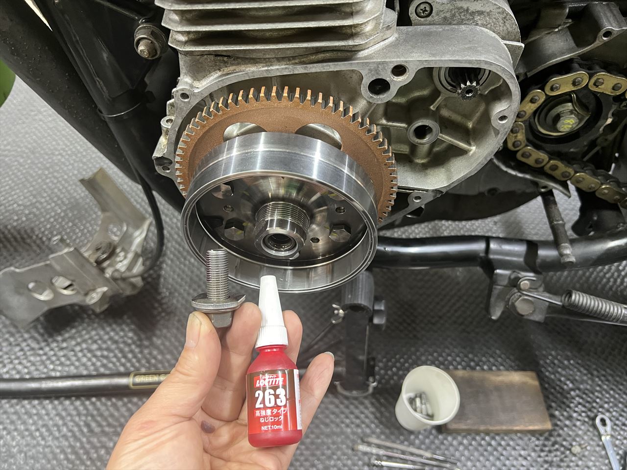 ローターボルトにもネジロックを塗布して組み付けます。
