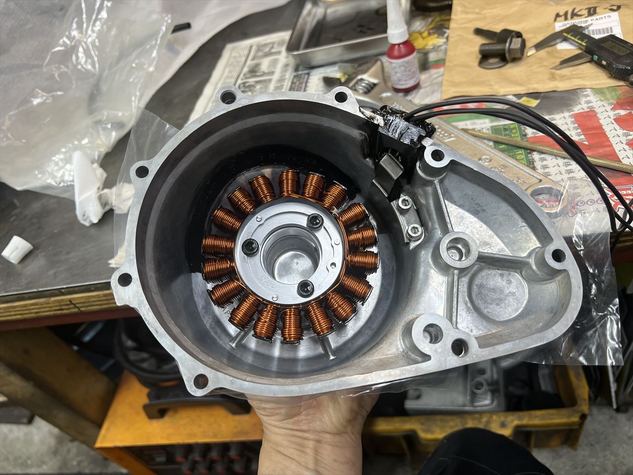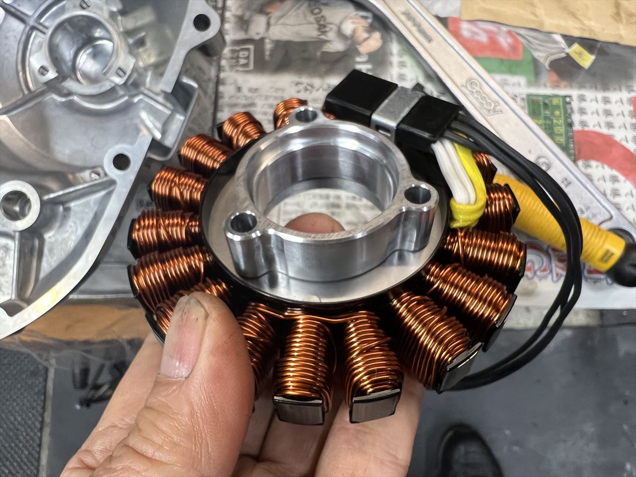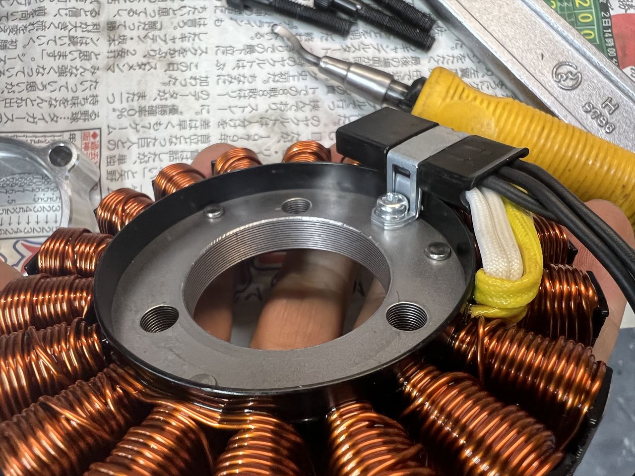 ステーターコイルをカバーに取り付けます。