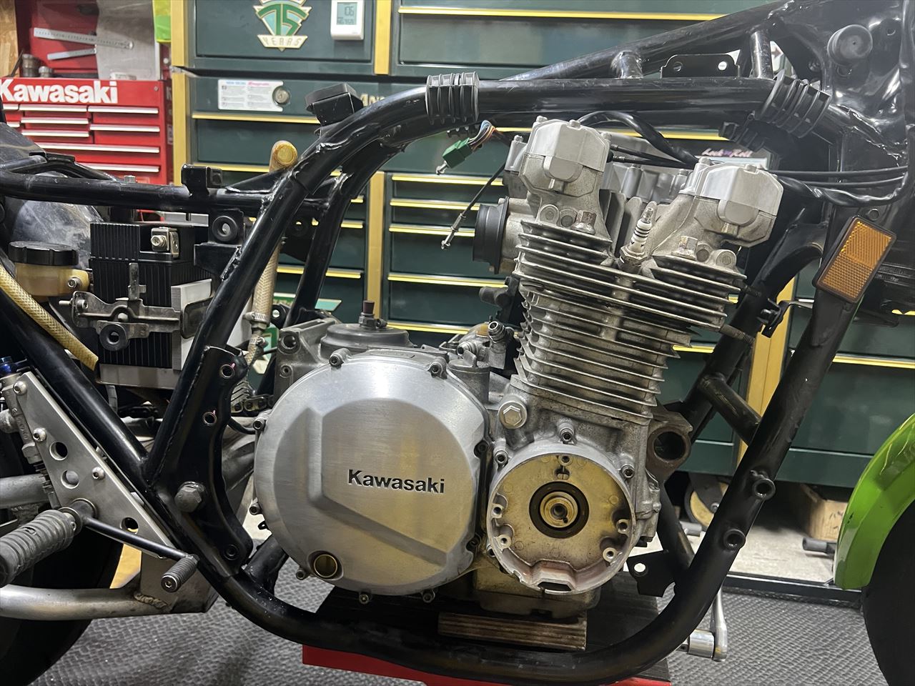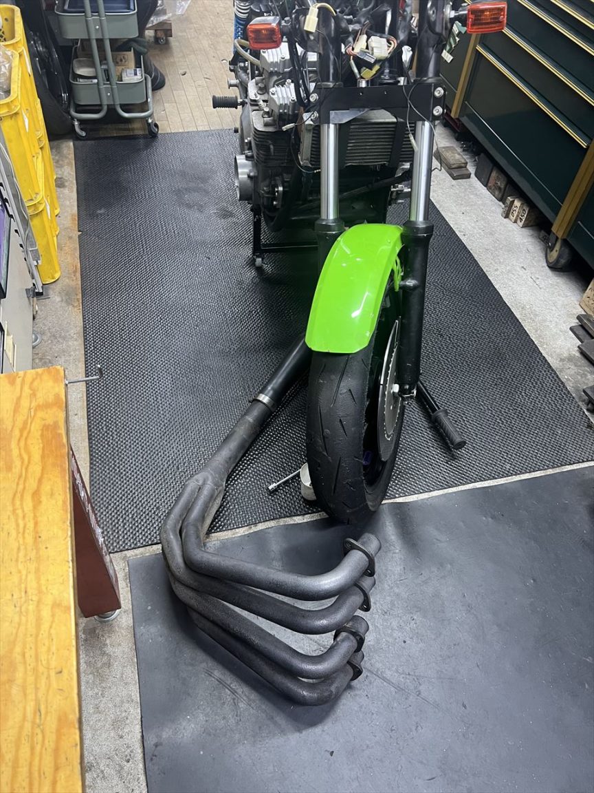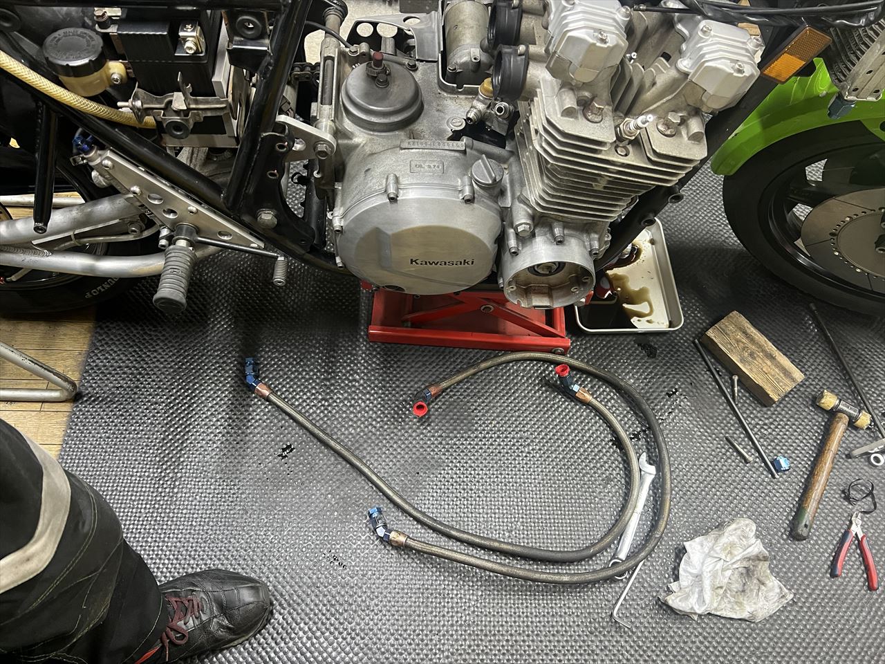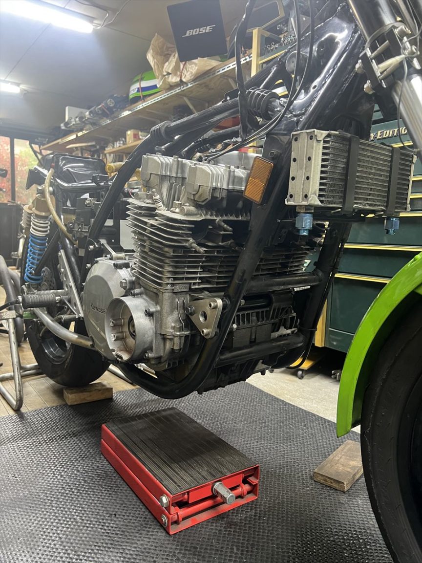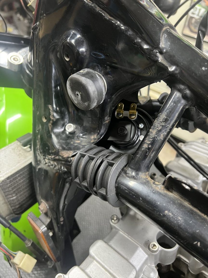 大型のオイルクーラーを付けるとホーンの設置場所に困りますよね。フロントのガセットに6ミリの穴を開けて谷間にミニホーンを取り付けると邪魔にならずにいいですよ。