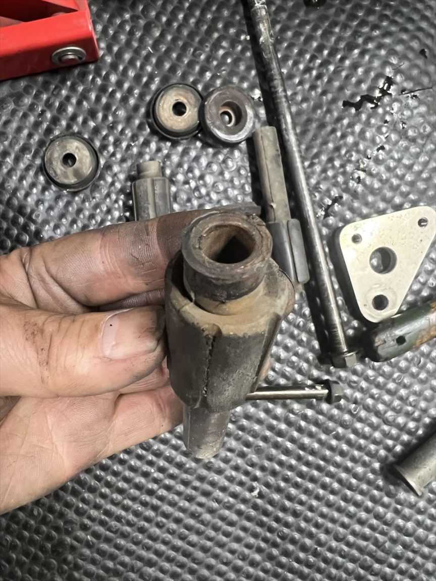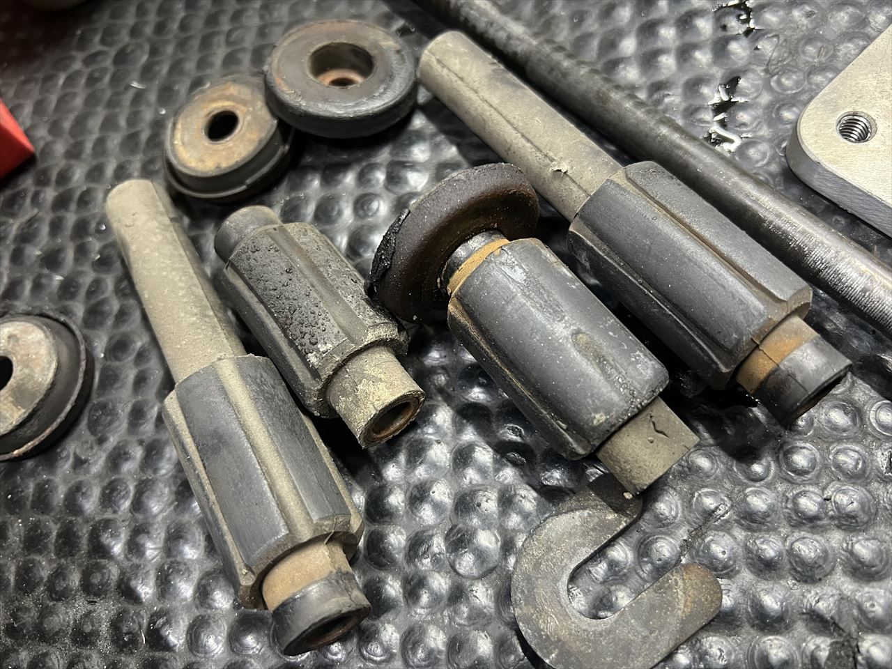 外したインシュレーターはこちら。ゴムは硬化してかなり摩耗しています。