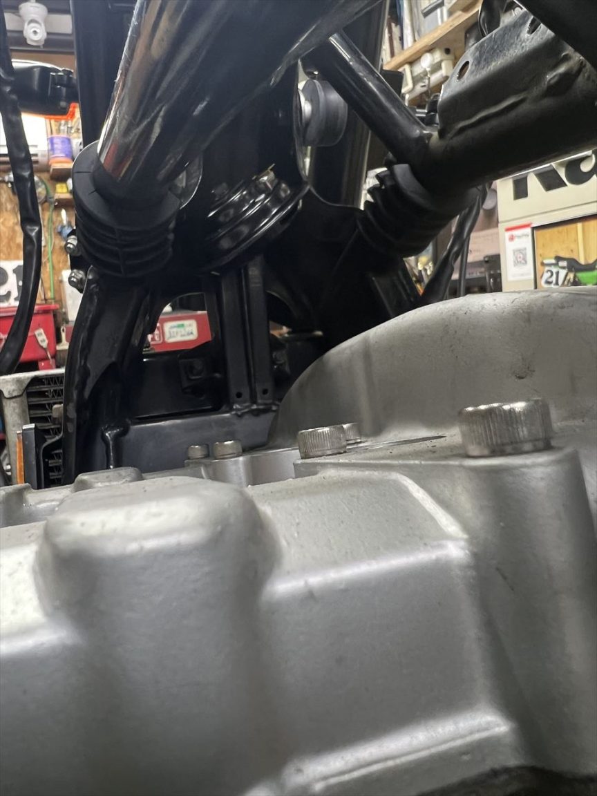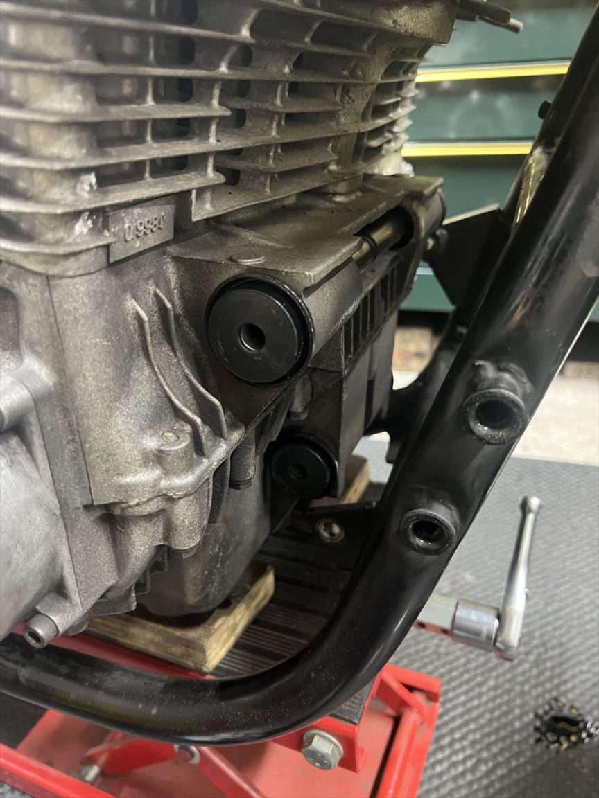 エンジンはチェーンの張力で後ろに引っ張られるので、インシュレーターは後ろ側が大きく潰れます。