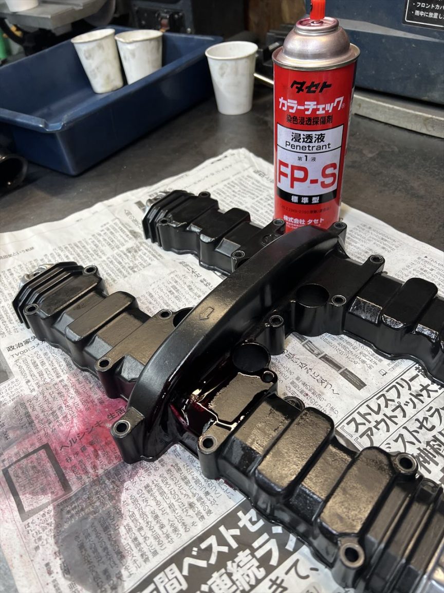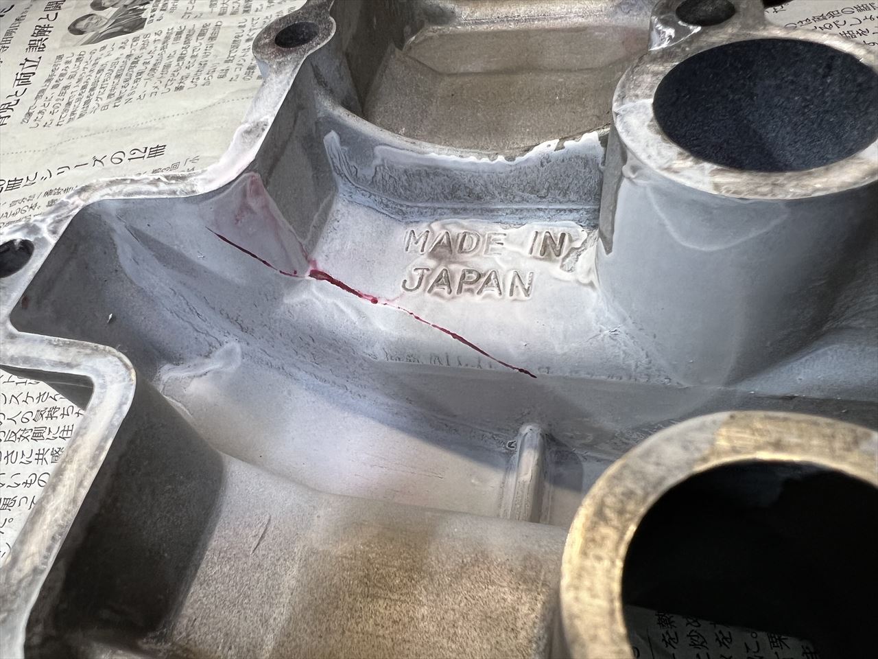 クラックが赤い線となって浮き出てきました。前回のポンチマークの外側に、前後15ミリほどクラックが伸びていますね。もう少しで端まで達するので、このヘッドカバーは交換することにします。純正のヘッドカバーは大きく分けて3種類あり、初期の未対策モデル、この場所が肉厚になっているモデル、この画像の物のようにリブが付いているモデルがあります。メーカーが対策するくらいなので、J系のウィークポイントといえるでしょう。公道車ではクラックはほとんど見かけませんが、サーキットを走ると結構な頻度でクラックは発生します。