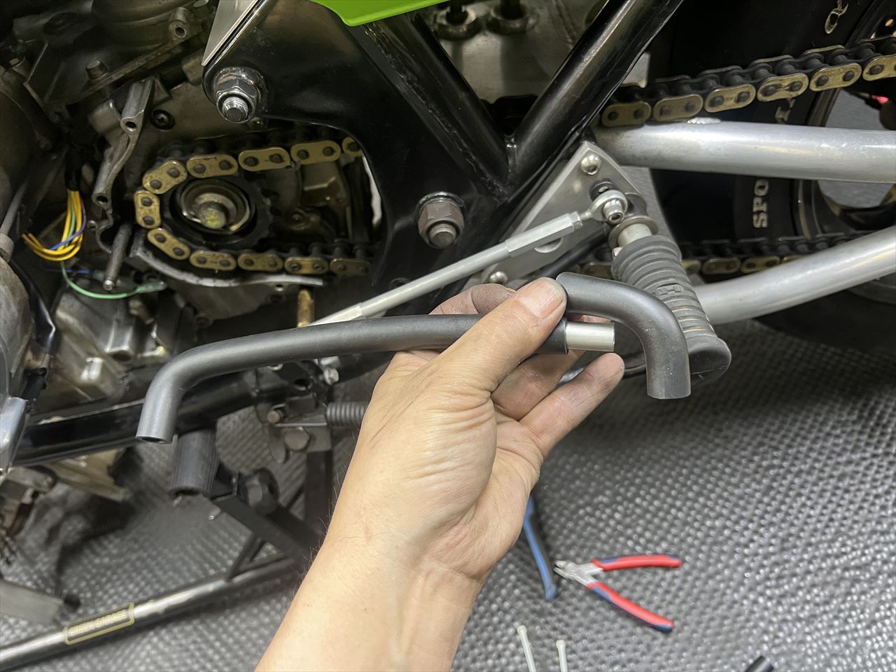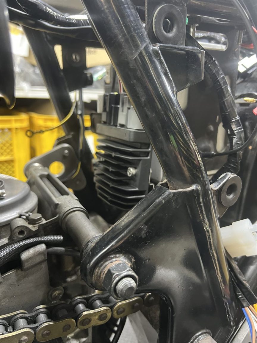 あとは少し作業待ちです。新規製作したフロントローターは若干手直し中で、スイングアームピボットに追加するチェーンスライダー用素材のナイロン棒も未入荷です。GW中なので、少し作業が停滞しますね。