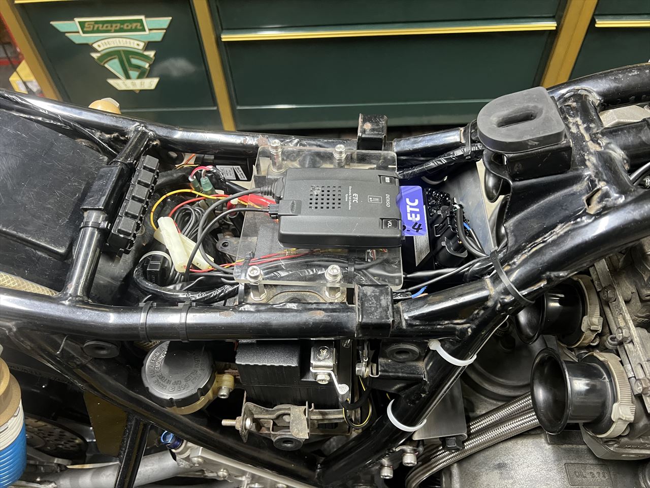 既存のETC車載器を復元します。今回、キャブ後方隔壁を追加したので、シートを外さないでのカードの脱着は少しし辛いようです。