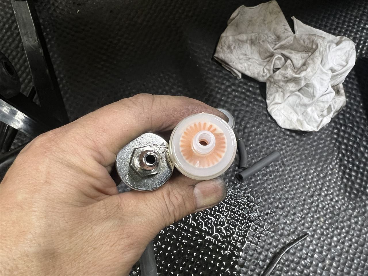 フィルターを外してみると、内径の小さいものが使われていました。大型車は燃料流量を確保するため、右側のように内径φ5ミリ以上のフィルターがいいでしょう。