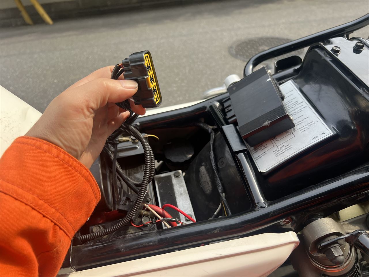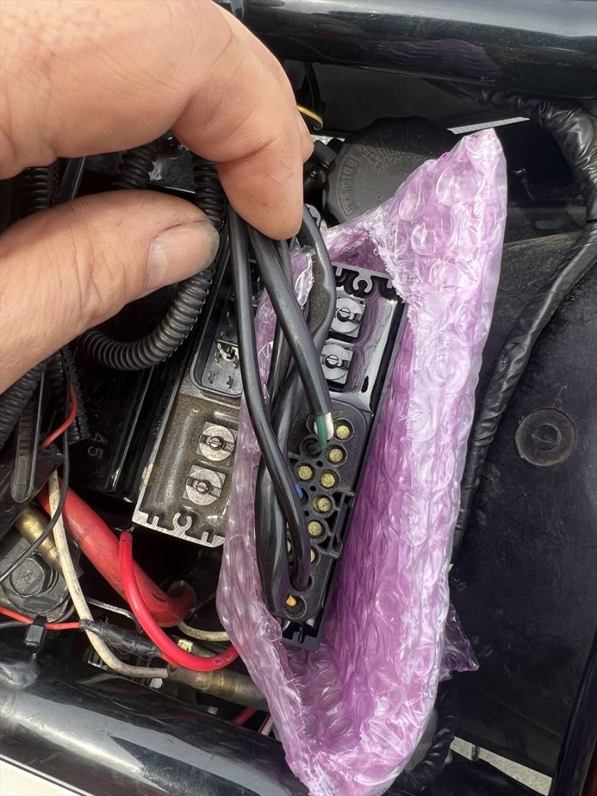 不具合は、走行中にいきなりエンジンだけ停止するそうで、イグニッションを切り、このSP2ユニットのコネクターをグリグリしてから再始動すると復帰するそうです。日に何度も発生するので、遠出も心配な状況だったとのこと。