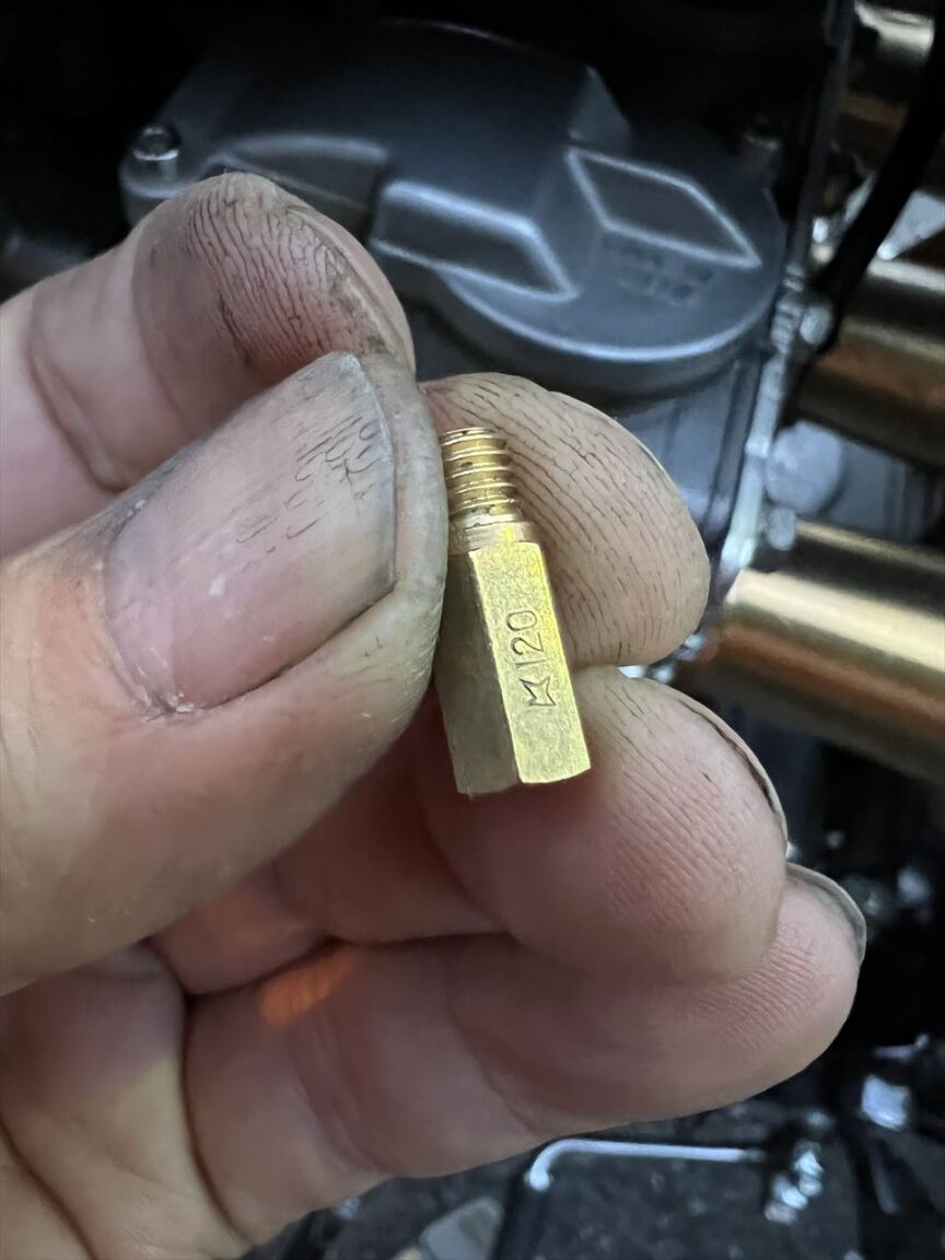 スロットルを全開にしてみると、途端にストールするので薄いようです。事前にメインジェットが90番であることを確認していたので、ファンネル+CRキャブ+集合管の組み合わせで一般的なジェット番手に変更します。