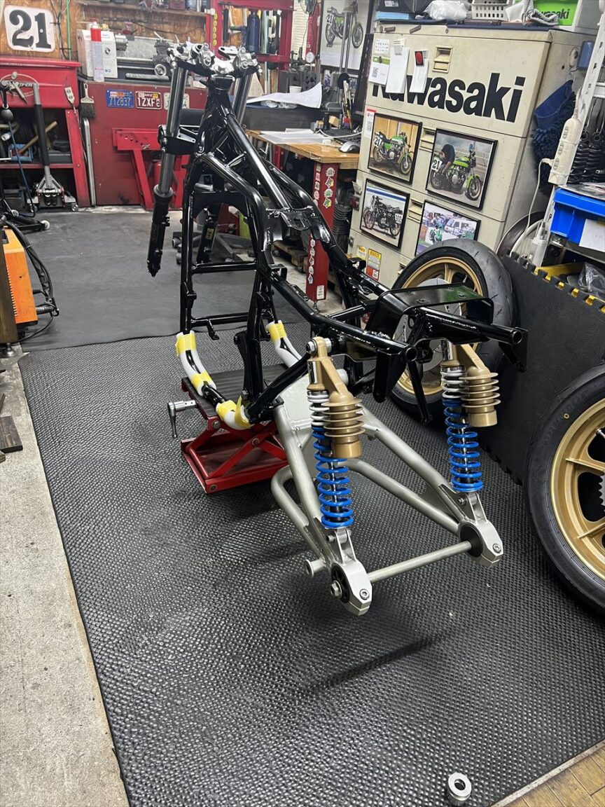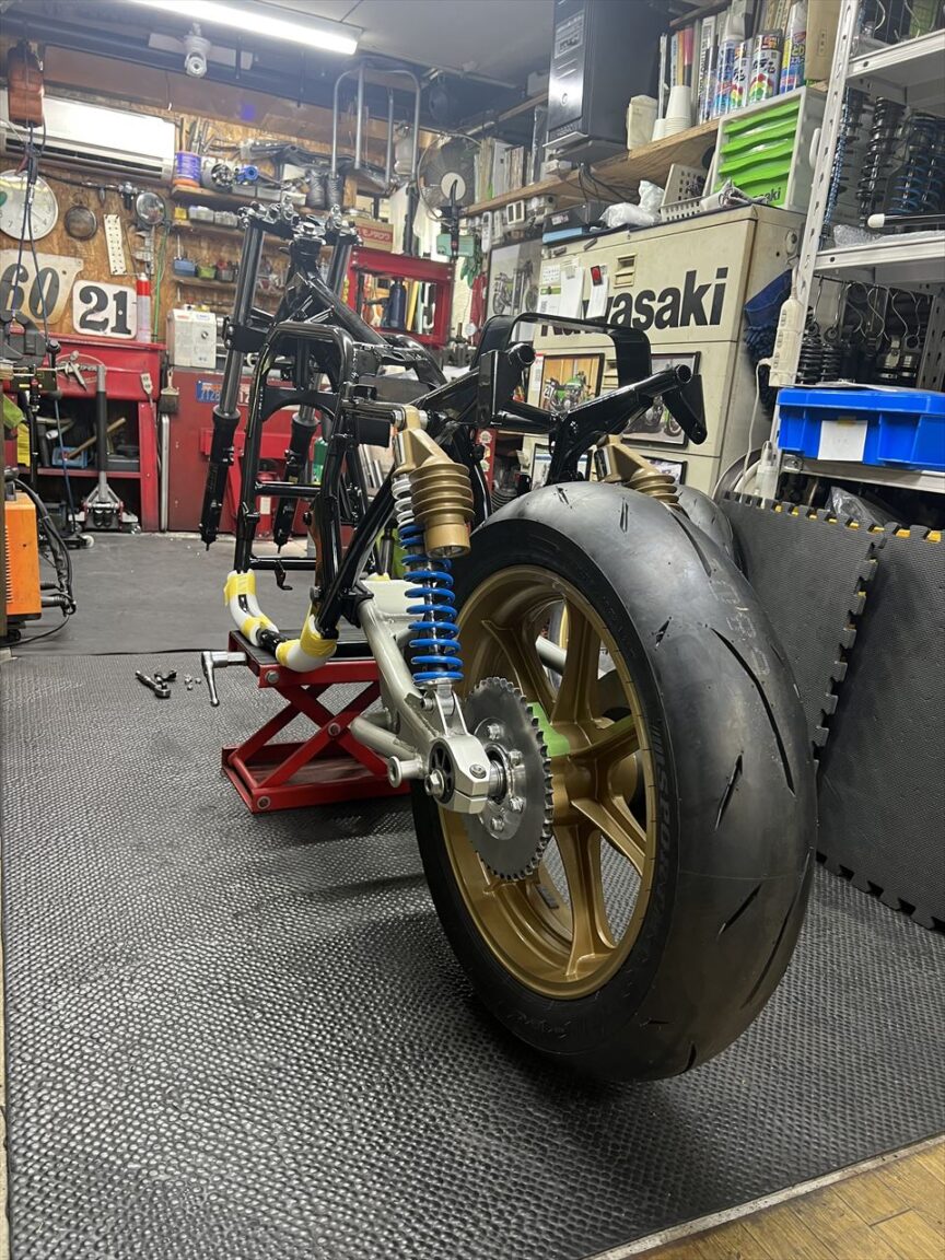 スイングアームを組み付けます。ZRX400のノーマルを改造し、サス受け、スタンドフック、エキセン、キャッチタンクをS1風にしたものです。仕上げにウレタン塗装しています。