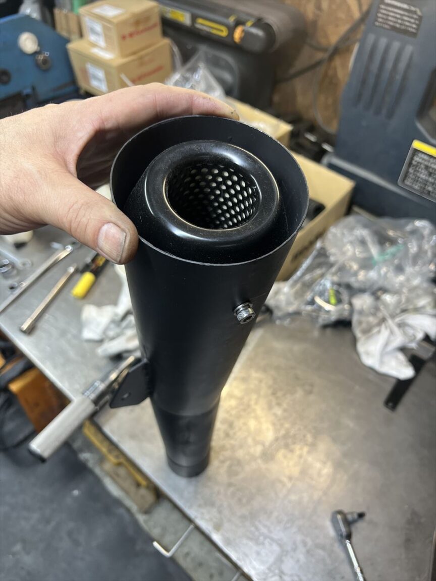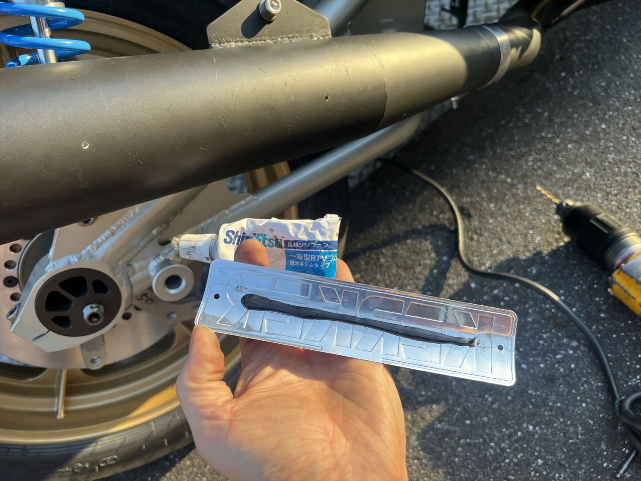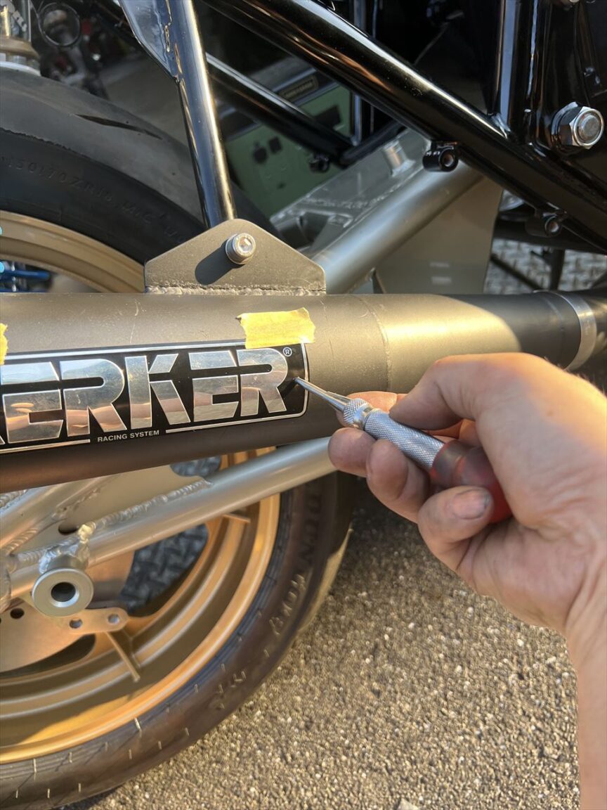 お持ち込みのサイレンサーエンブレムを取り付けるので、位置決めします。