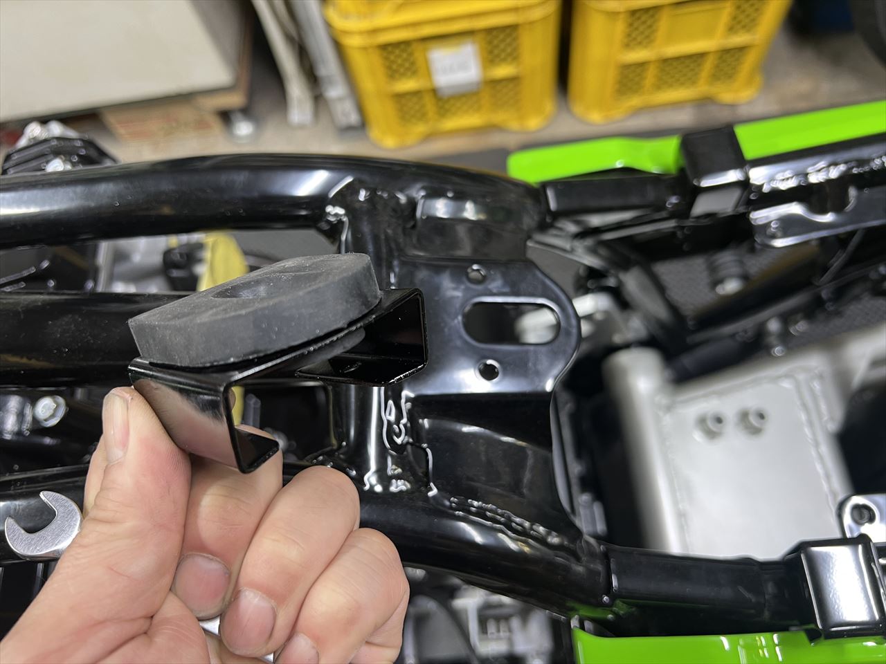 続いてタンクマウントです。S1はしていなくてワークス車だけやってあるタンク上げですが、本来はブルーマグナムなどのスペシャルキャブのリンケージを逃げるために行ったと思われます。今回はCRキャブを使うのでもちろんタンクを上げる必要はありませんが、見た目の印象がかなり変わるので、ワークスS1仕様を作るときの必須項目として取り入れています。フロントのマウントは2センチほど上に新設します。