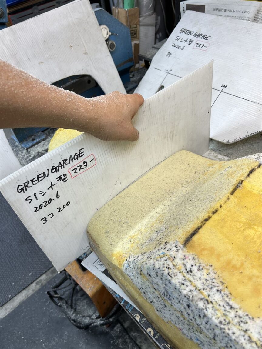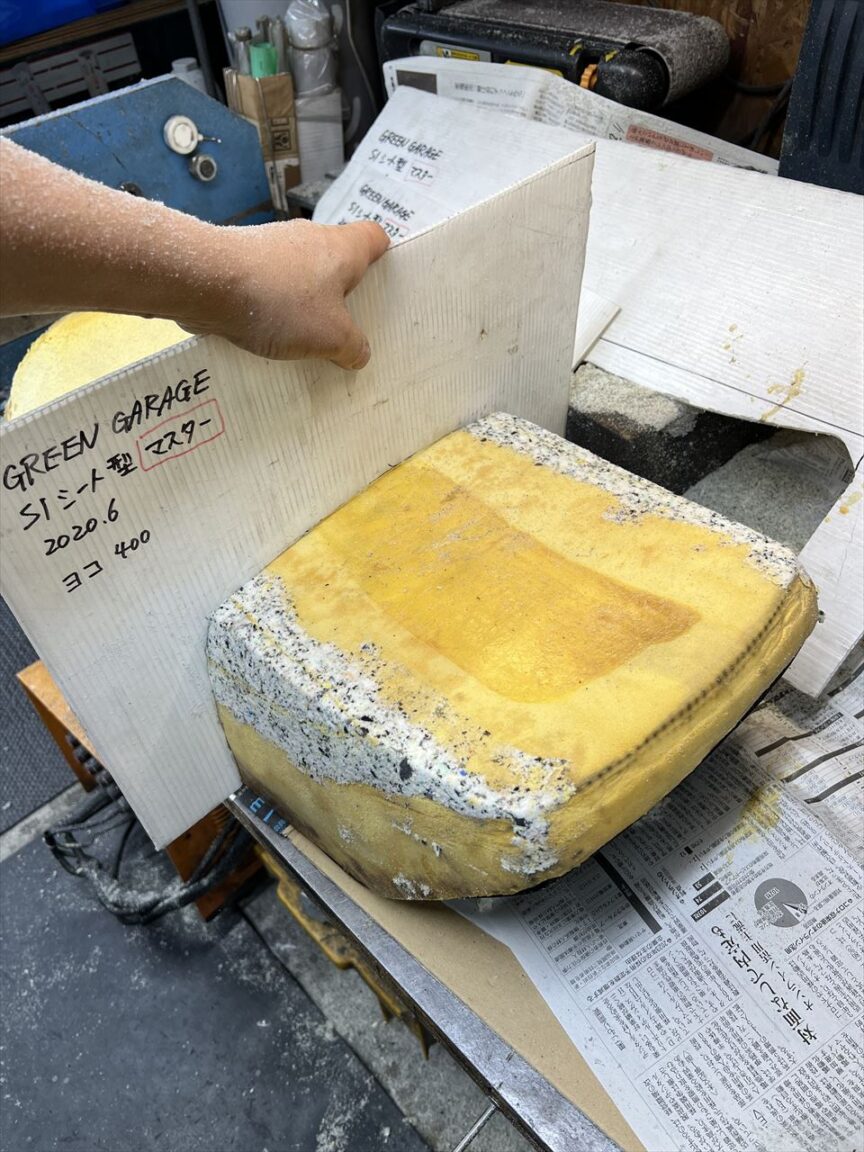 このあと、シート工場に送り、ワンオフでこのシートに合わせたS1表皮を製作して張り込んだら完成です。ベルトサンダーを使った削り作業はこんな感じです。