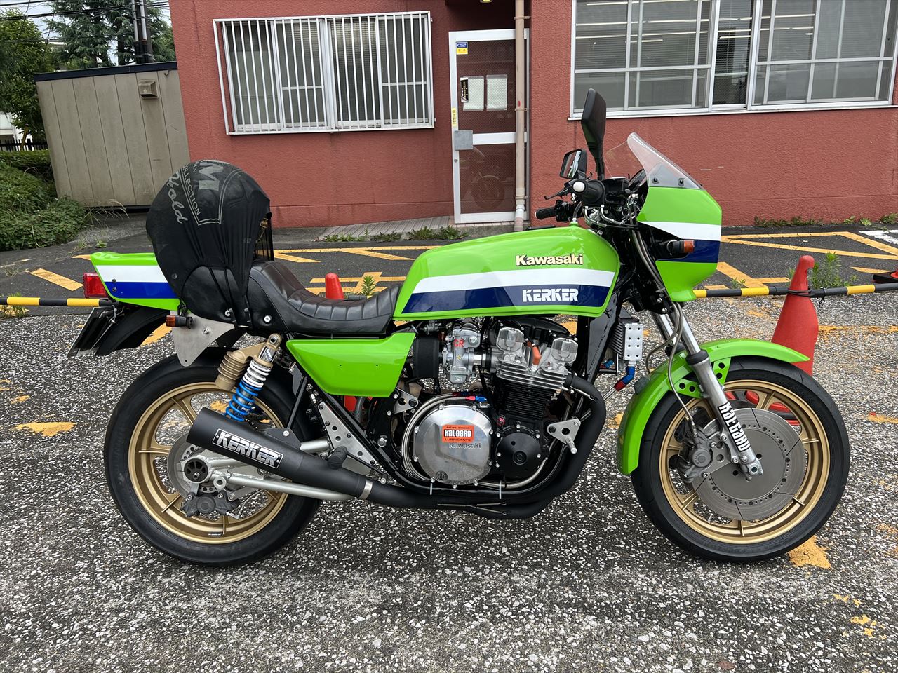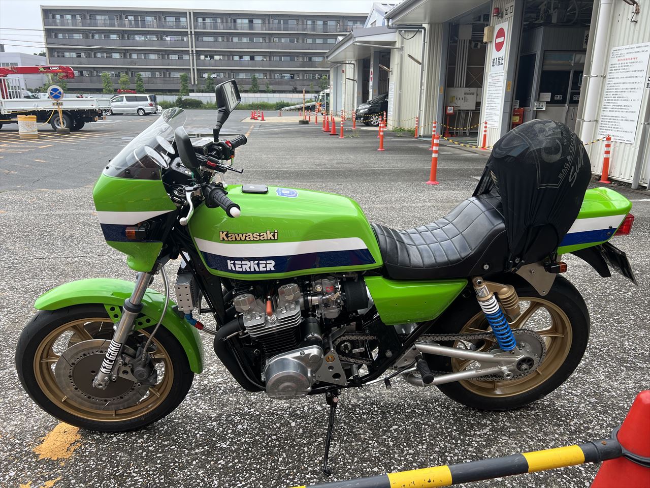 車検証はこちら。作業の都合で一旦私名義で登録します。新規輸入車の国内初めての登録となるので、新車と同じ扱いの3年車検です。備考欄にある「保安基準適用年月日 昭和57年12月31日」が旧車を登録する際の大事なポイントで、正しく資料を提出し実際の製造年で登録することで、ヘッドライト常時点灯や音量規制などの検査を回避することができます。このあとエンジンの慣らしとキャブセッティングとロングの走行チェックを経て、遠方のオーナーさんの元へ発送することになります。ナンバーは代行業者を使い、日本全国名義変更可能です。