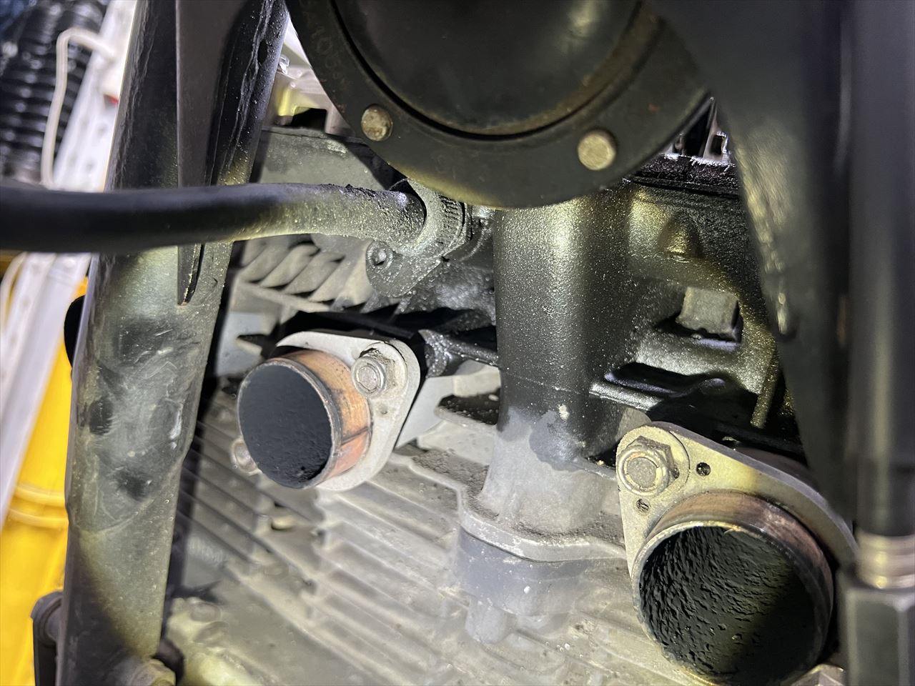こちらはオイル漏れが始まった4月に撮影したもの。エキパイ内からオイルが噴出しているように見えます。
