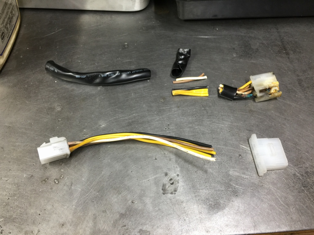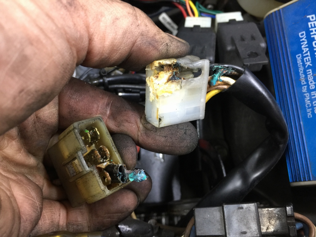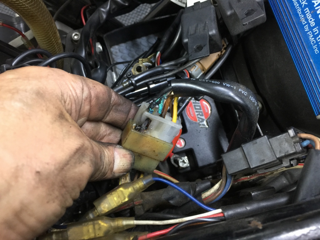 ジェネレーターハーネスのコネクターは、抵抗熱で溶けてくっついています。