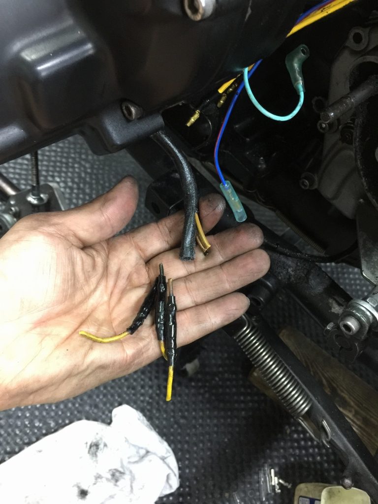 溶けたレギュレーターハーネスの端子は、切断して新品に交換します。