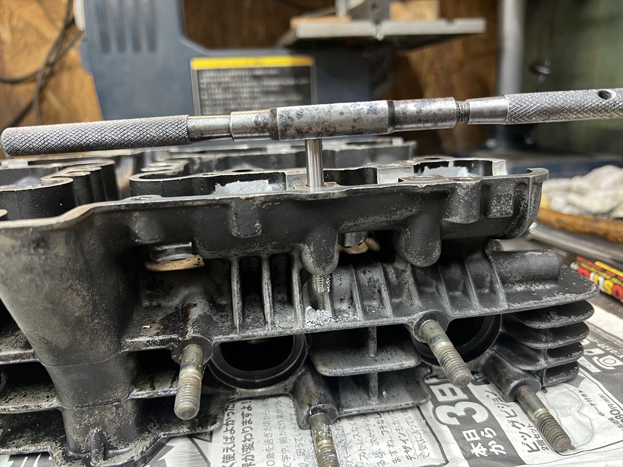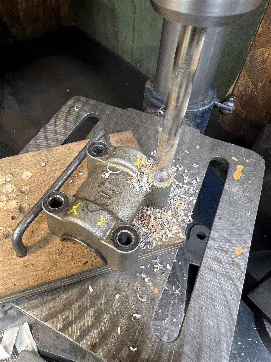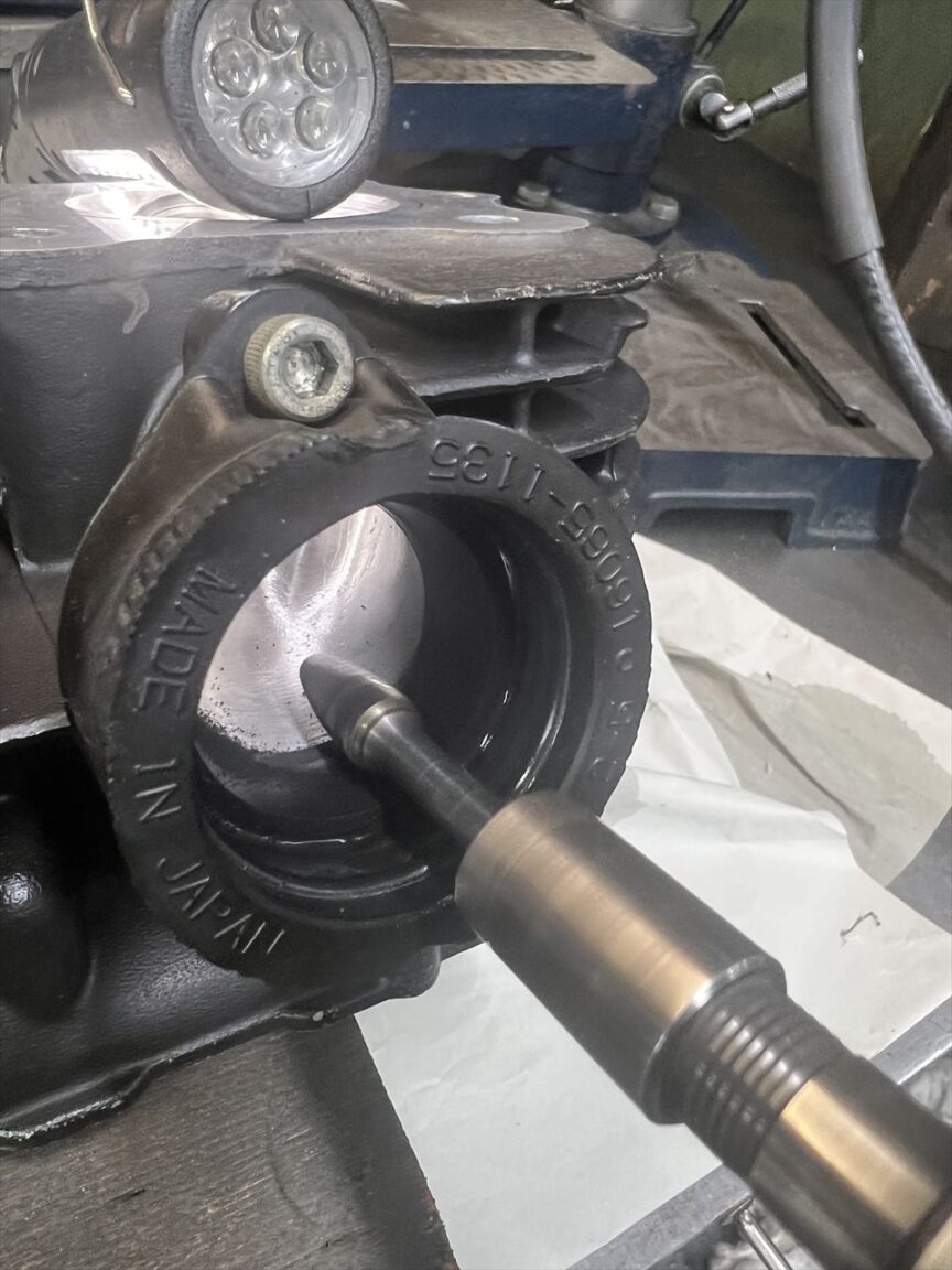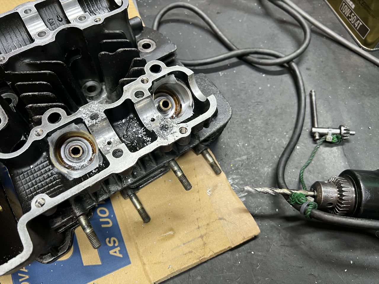 ヘリサートを抜いたら、ドリルで下穴を掘り下げます。その下にはオイル通路があるので、通路ギリギリまでを狙います。